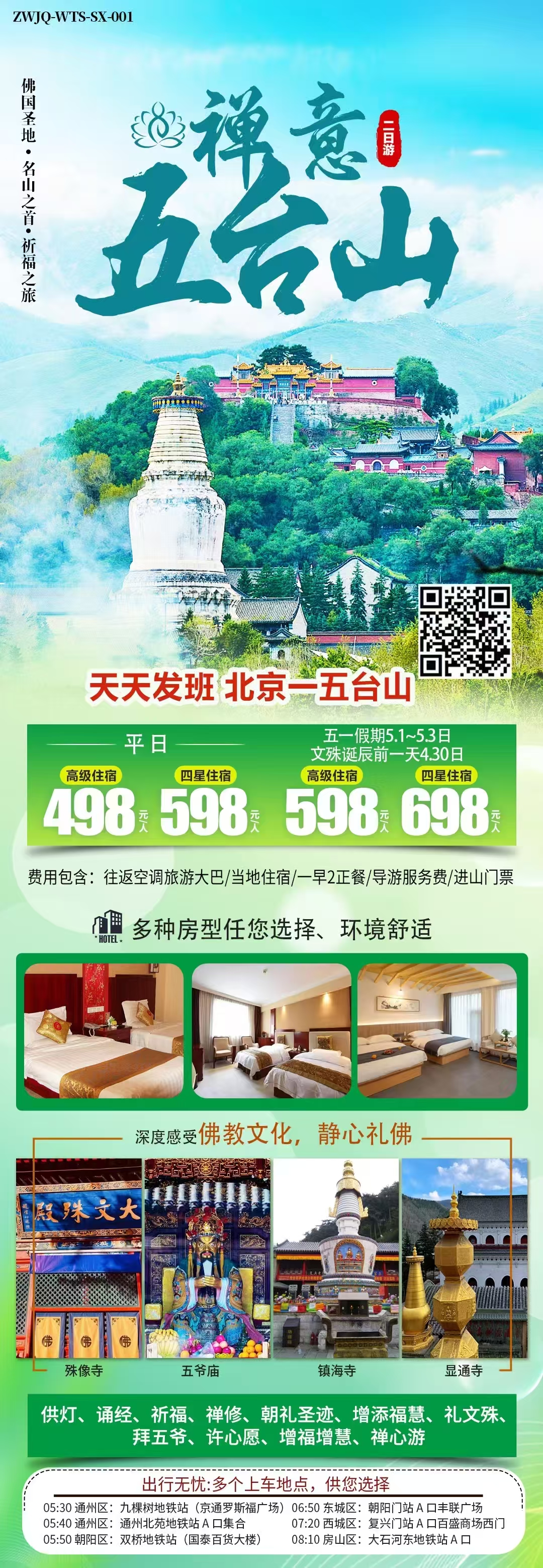 北京🚌五台山·4月份天天发团 ⛰ 四大佛教名山之首 🌻 用车:往返空调旅游大巴车 🌻 住宿:景区内双人标准间 🌻 门票:含五台山进山门票 🌻 用餐:2正1早餐,含一餐全素自助 🌻 导游:佛学领队专业讲解 🌻 保险:赠送旅游意外险 市区多点上车:九棵树、通州北苑、双桥、朝阳门、复兴门、大石河 郊区可升级接送服务