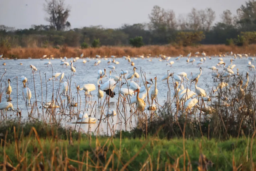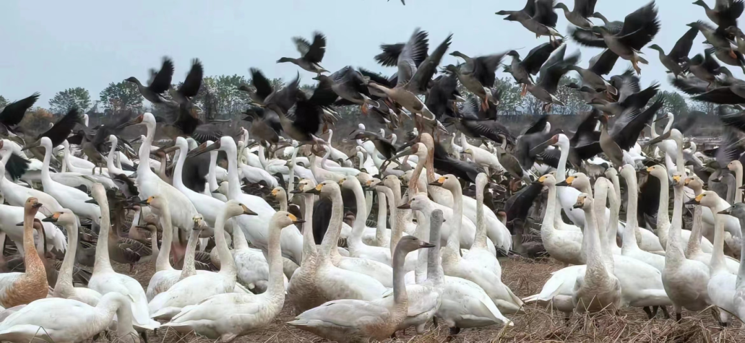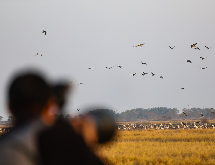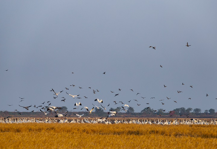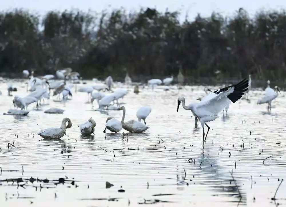 为保护好候鸟栖息环境,确保白鹤等珍稀鸟类有足够的越冬食物,从2020年起,这里每年会预留千亩未收割的稻田,作为候鸟越冬的食物补给,打造越冬候鸟食堂。