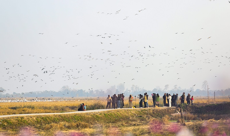 余干县插旗洲是规划的观鸟点之一。它位于鄱阳湖东南岸,有大量的珍稀候鸟分布,白鹤、灰鹤、东方白鹳,还有很多雁鸭类种群,是观看鹤类的一个绝佳点位。江西省对规划的每个观鸟点都建了相应设施,如观鸟长廊、观鸟台、观鸟亭等,方便观鸟。长廊进行了伪装,既能避免惊吓到鸟类,又能让游客近距离观看到湖区的各种鸟类。长廊内,拍鸟爱好者可以架着设备,捕捉这些湖区精灵的每一个精彩瞬间。