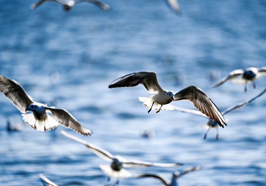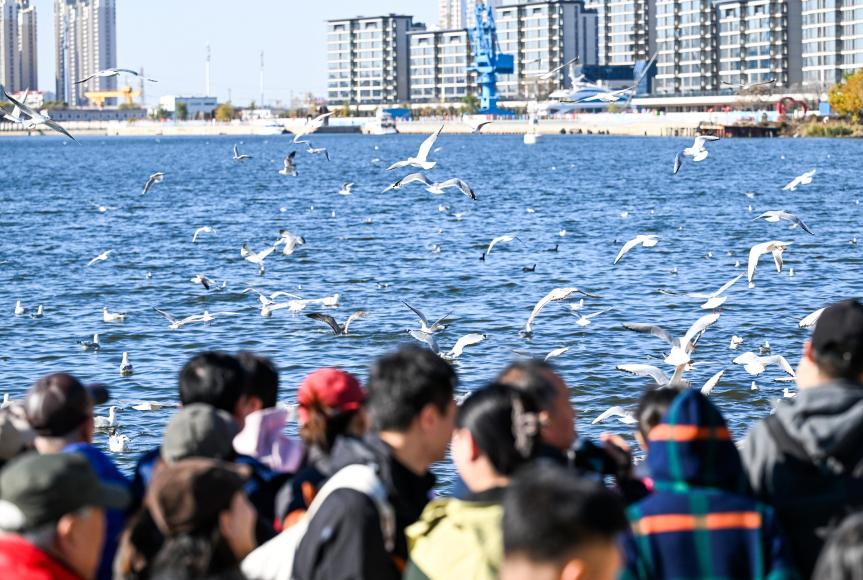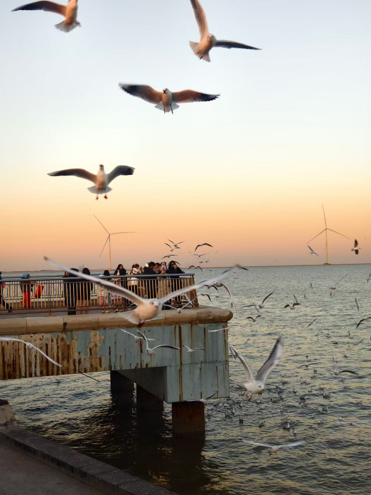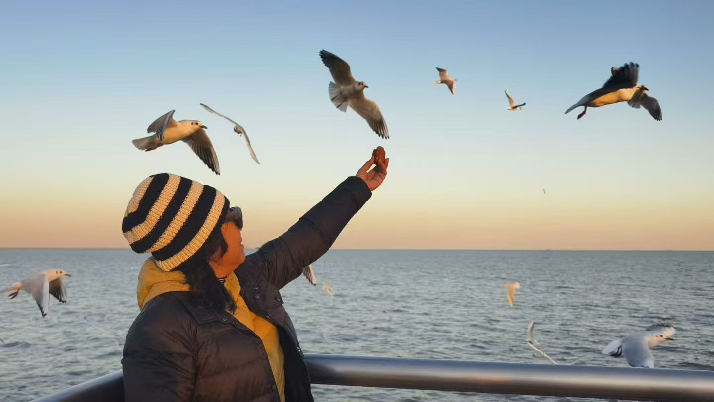 初冬时节,新区东疆亲海公园迎来了大批红嘴鸥,成百上千只红嘴鸥盘旋于堤坝与海面之间,时而扎入浪尖觅食,时而停驻栈道休憩,成群的“白色精灵”掠过碧海蓝天,与市民游客上演暖心互动。观海平台上,游客们手持面包碎屑轻抛空中,海鸥精准俯冲叼食,清脆鸣叫与欢声笑语交织成趣。