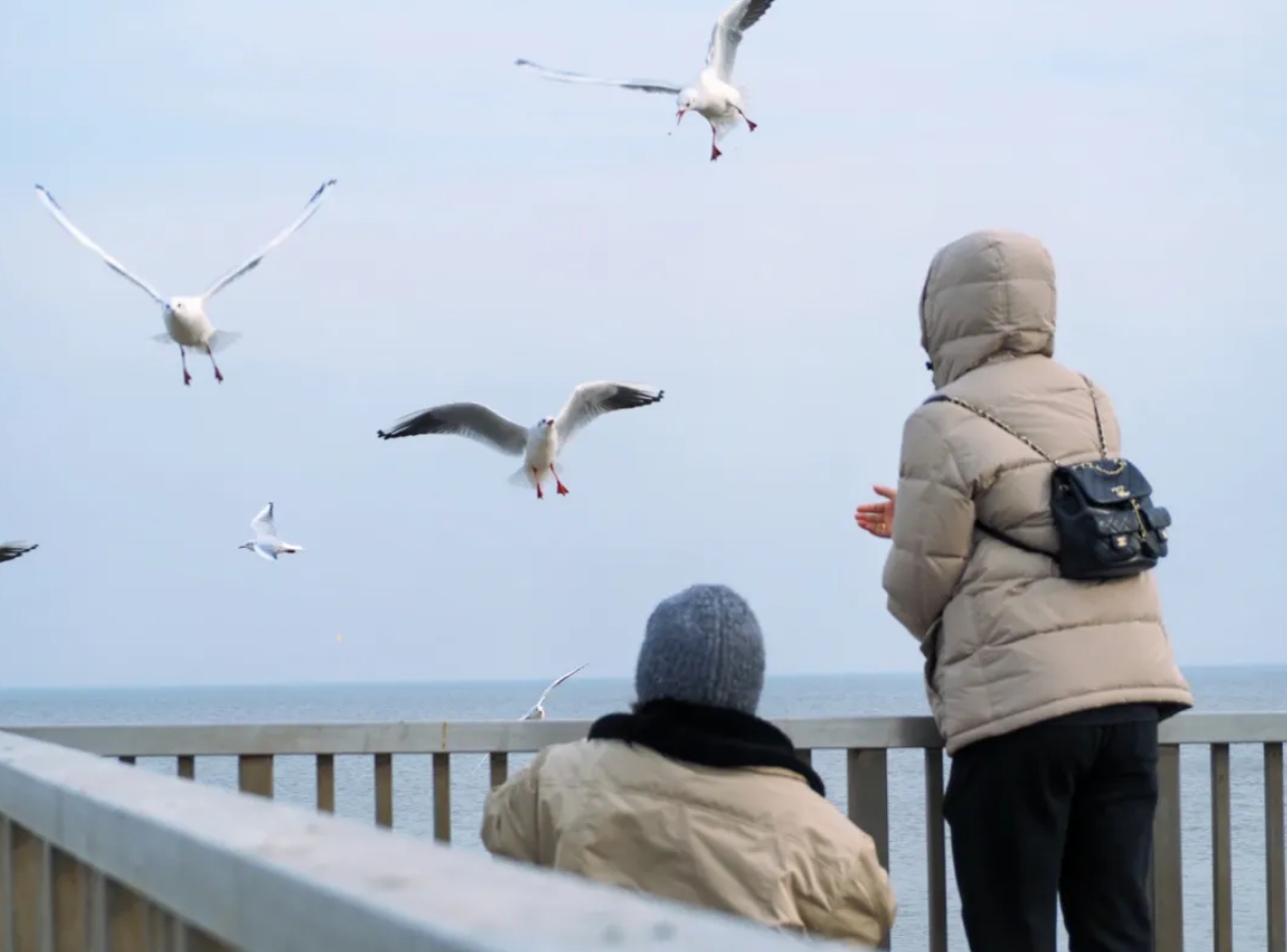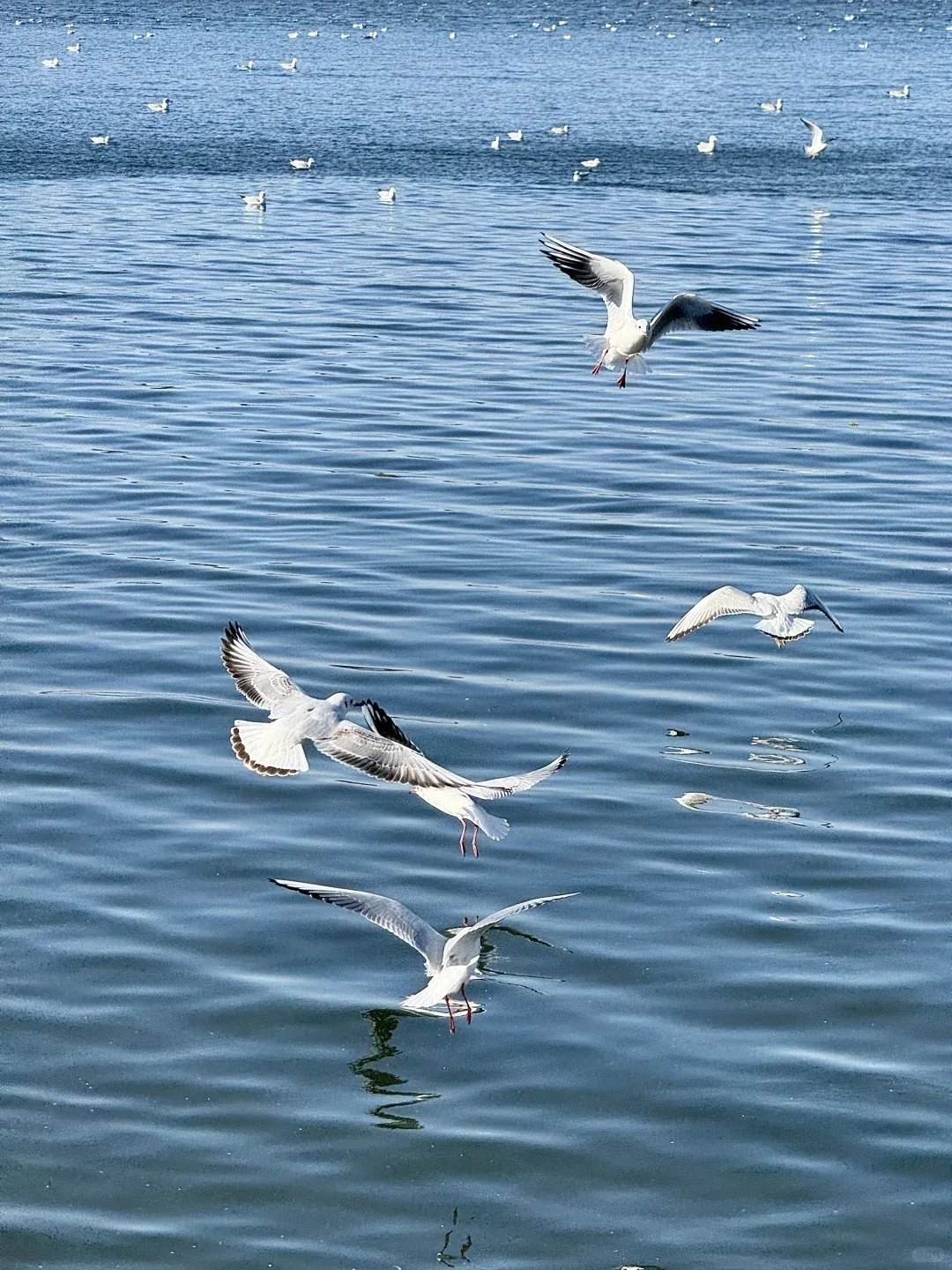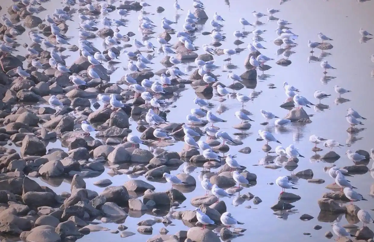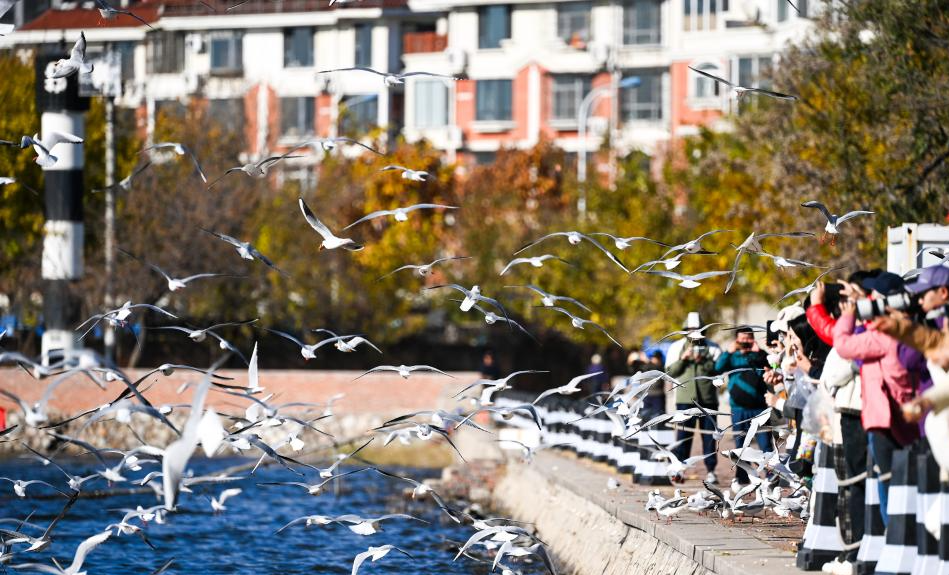 初冬时节,新区东疆亲海公园迎来了大批红嘴鸥,成百上千只红嘴鸥盘旋于堤坝与海面之间,时而扎入浪尖觅食,时而停驻栈道休憩,成群的“白色精灵”掠过碧海蓝天,与市民游客上演暖心互动。观海平台上,游客们手持面包碎屑轻抛空中,海鸥精准俯冲叼食,清脆鸣叫与欢声笑语交织成趣。