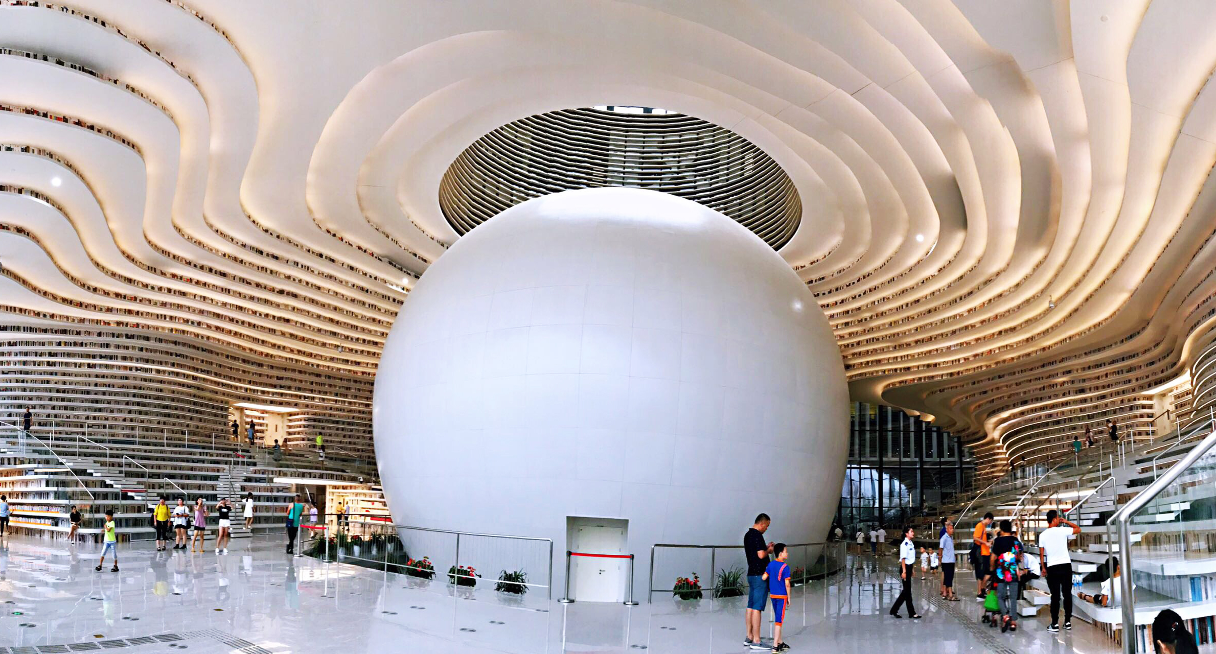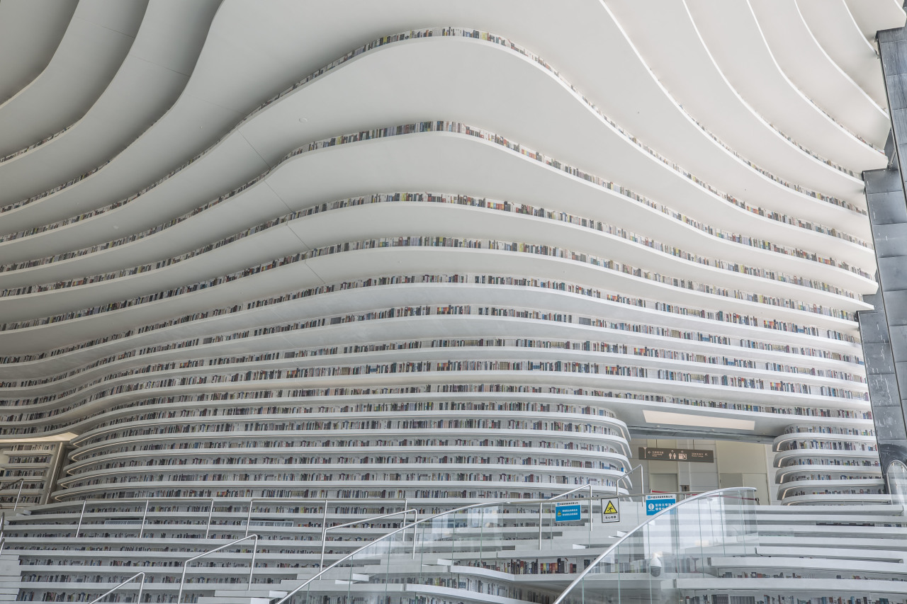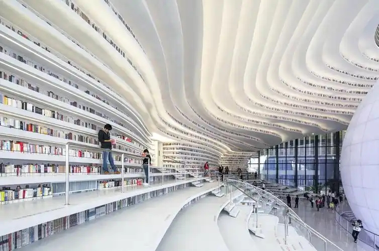 提到滨海文化中心,首当其冲的便是被誉为“全球最美图书馆之一”的滨海图书馆。其内部最震撼的设计莫过于形如波浪的层层叠叠书架,被称为“书山”。站在一层仰拍,仿佛置身于知识的峡谷之中,极具纵深感和视觉张力。