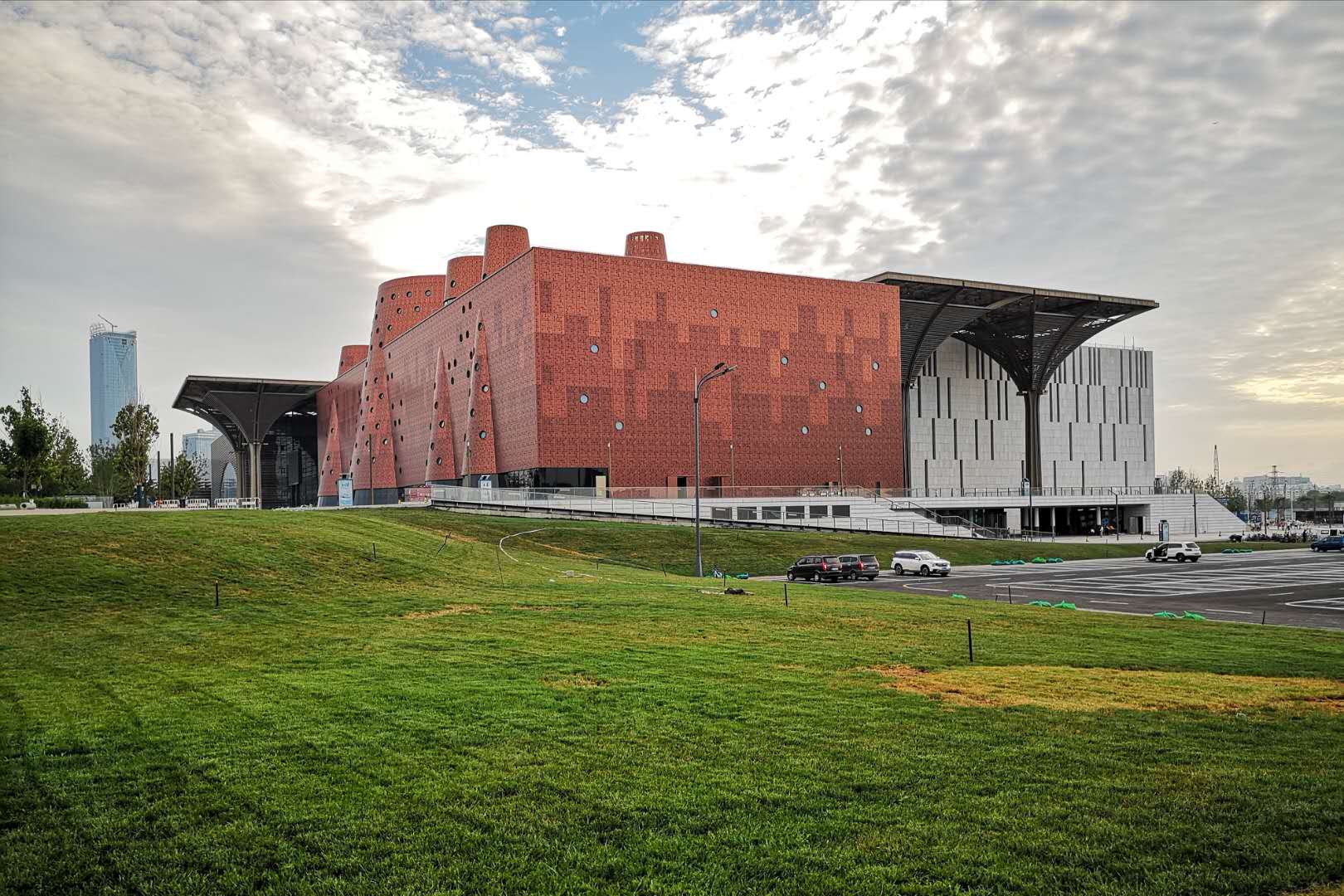 演艺中心的外形如同一块被风拂过的金属绸缎,曲面屋面由数千块铝板拼接而成,极具流动感。傍晚时分,夕阳斜照在金属表面,泛起金色光泽,此时用低角度仰拍,可突出建筑的动态美感。