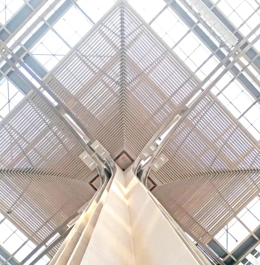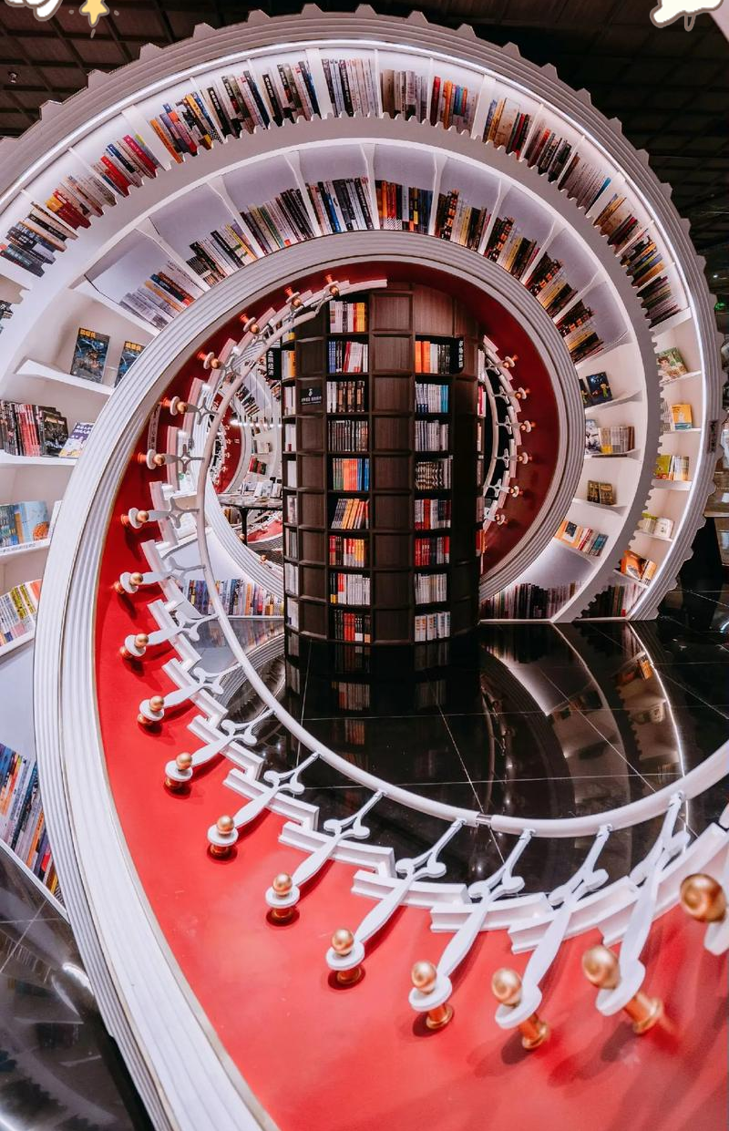 - 图书馆中庭:使用三脚架固定位置,拍摄对称构图,突出“眼球”天窗与书山的呼应。