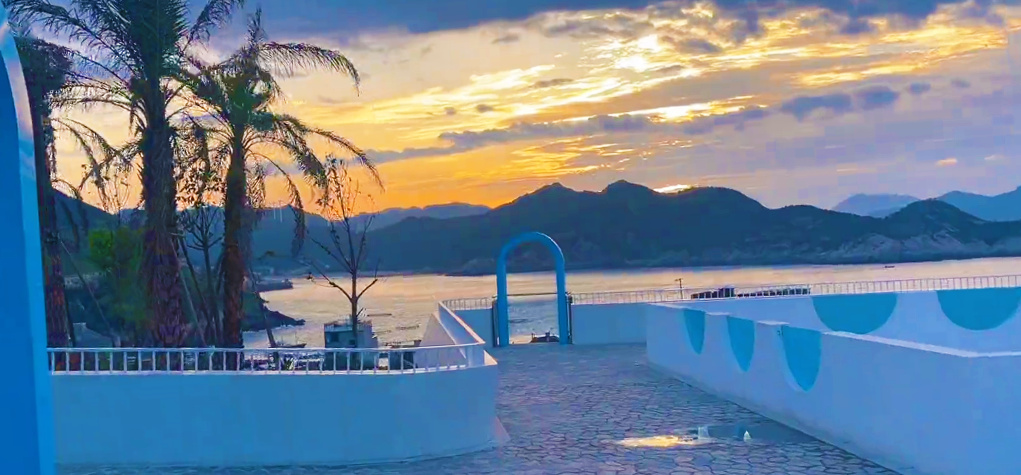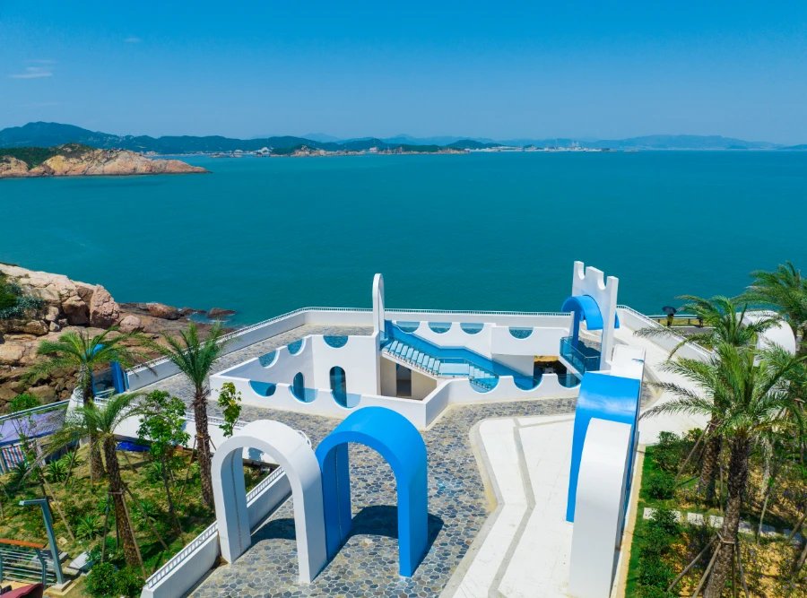 海尾角观景台是“东海1号”上的一处著名打卡点。这里既是观景台,也是休息区。建筑主体为白色,拱形门洞搭配彩色玻璃,颇有地中海风情。