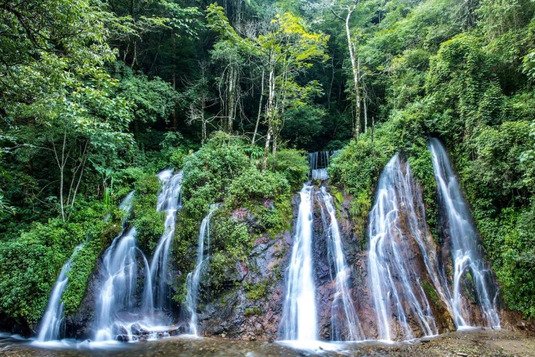 站在戛洒镇的远方眺望,南恩瀑布宛如一位身披洁白婚纱的仙子,在哀牢山的怀抱中轻盈起舞,其景致宛如一幅生动绝妙的山水画卷。南恩,这一名字在傣语中意为“银白色的水”,它源自云南哀牢山深处那云雾缭绕的原始森林。这里的植被茂密,树木参天,水土保持得当,使得水流源源不断,瀑布常年流淌不息。真正是山高水高,二者相映成趣。