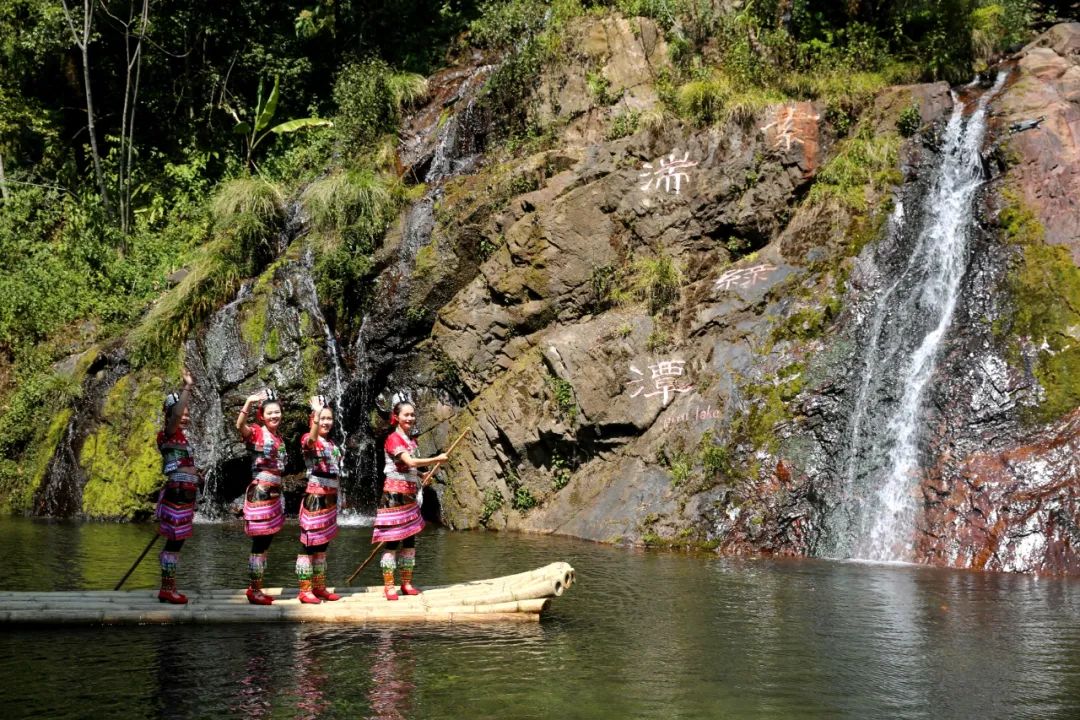 淙淙的流水汇集成了幽幽的深潭,盛装的花腰傣少女乘着竹筏游弋于碧波之上,行走于山水之间,低头看溪水潺潺,抬头望白云悠悠,构成一幅人在谷中走,如在画中游的绝美画卷。