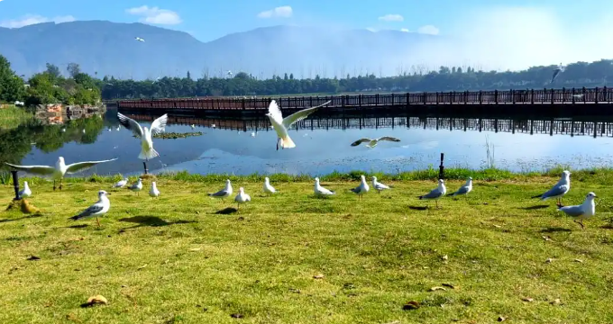 异龙湖可乘坐米轨小火车赏湖景,漫步湖心栈道看候鸟,下午逛石屏古城,打卡袁嘉谷故居、文庙,石屏炭火烤豆腐。