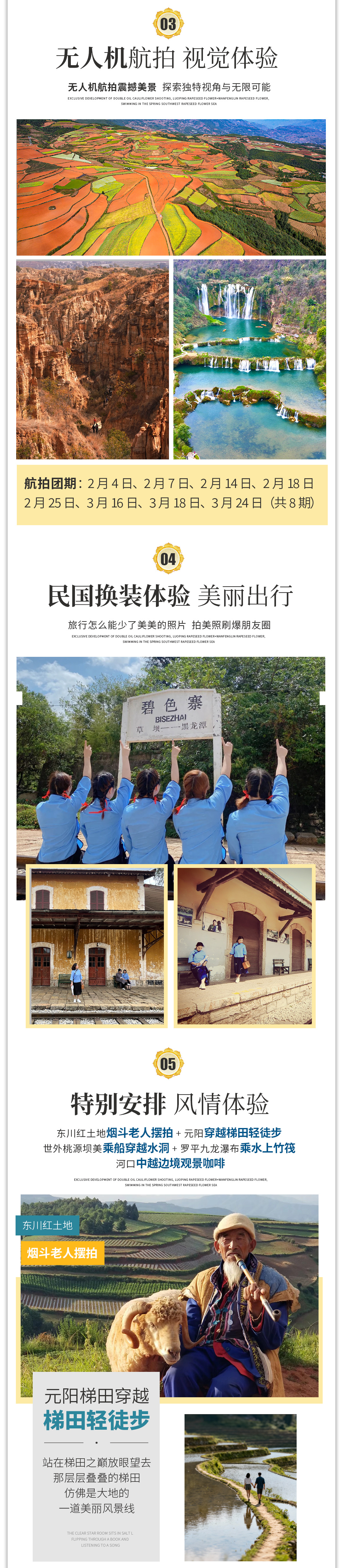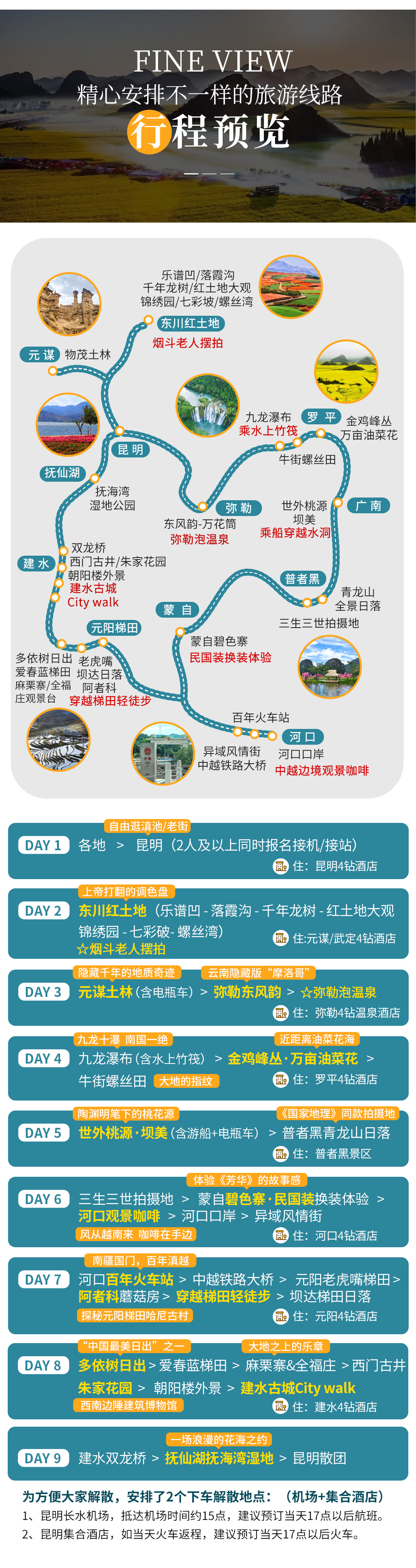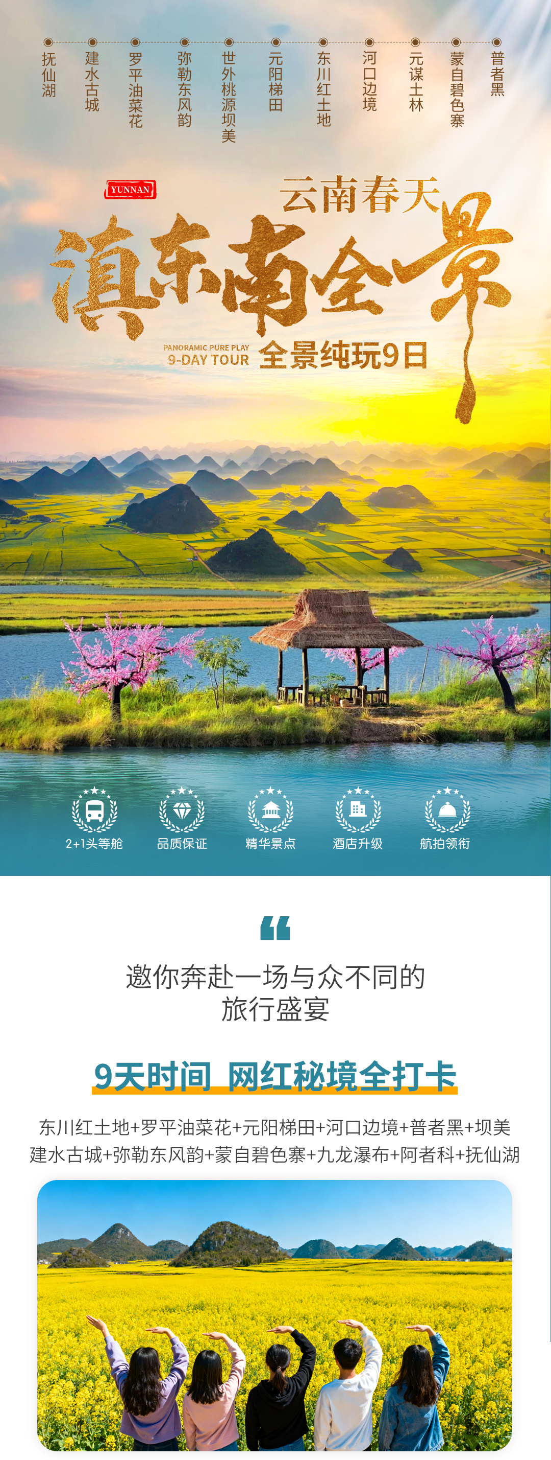 - 云南 昆明 元阳梯田- 罗平油菜花- 东川红土地- 建水古城- 弥勒东风韵- 河口边境风情- 普者黑- 世外桃源