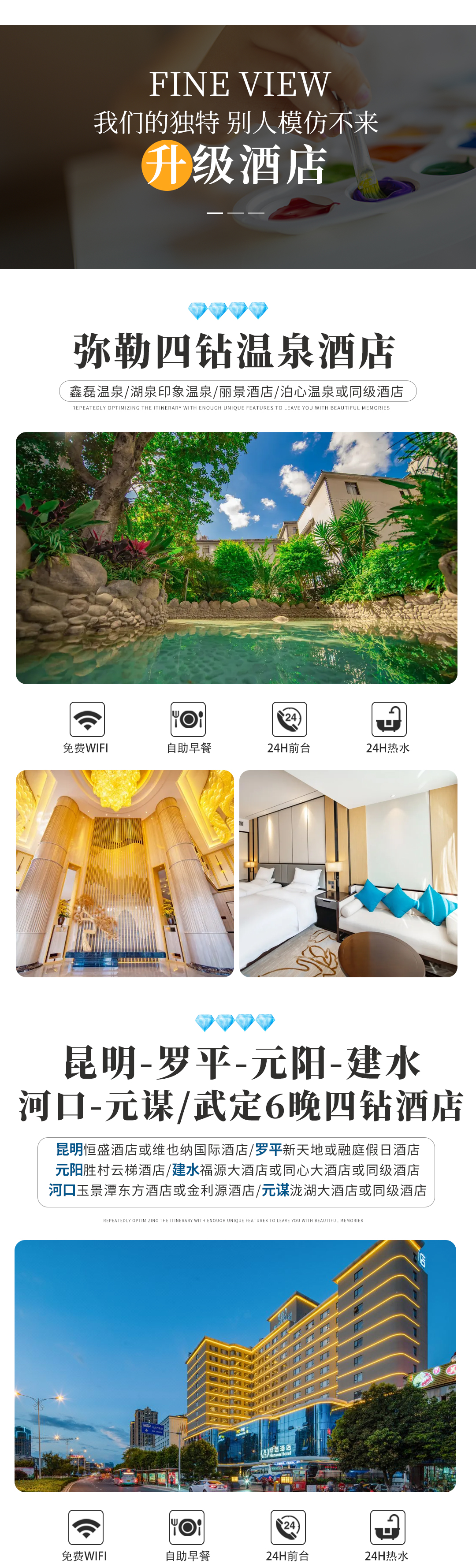3、住宿:全程8晚住宿{7晚4钻酒店+1晚景区客栈(昆明4钻酒店、元谋/武定4钻酒店、弥勒4钻温泉酒店、罗平4钻酒店、普者黑景区客栈、河口4钻酒店、元阳4钻酒店、建水4钻酒店)}