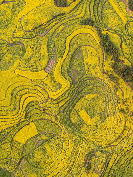 之后前往【牛街螺丝田】,放眼望去圆周梯田一圈圈往上延伸,形成螺丝状的田地,像无数金龙盘卧,这是大自然与人工的杰作,历经勤劳智慧的农民修造耕耘,形成了色彩鲜明、线条优美、蔚为壮观的奇妙景色,是罗平油菜花海醉人美丽的地方!