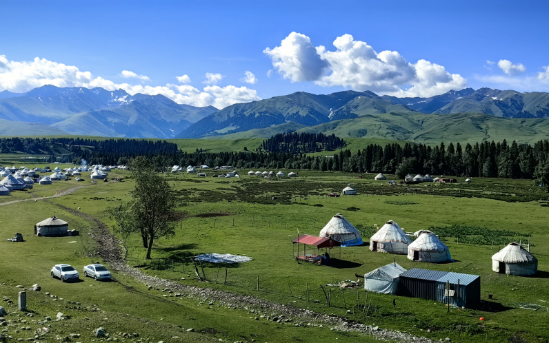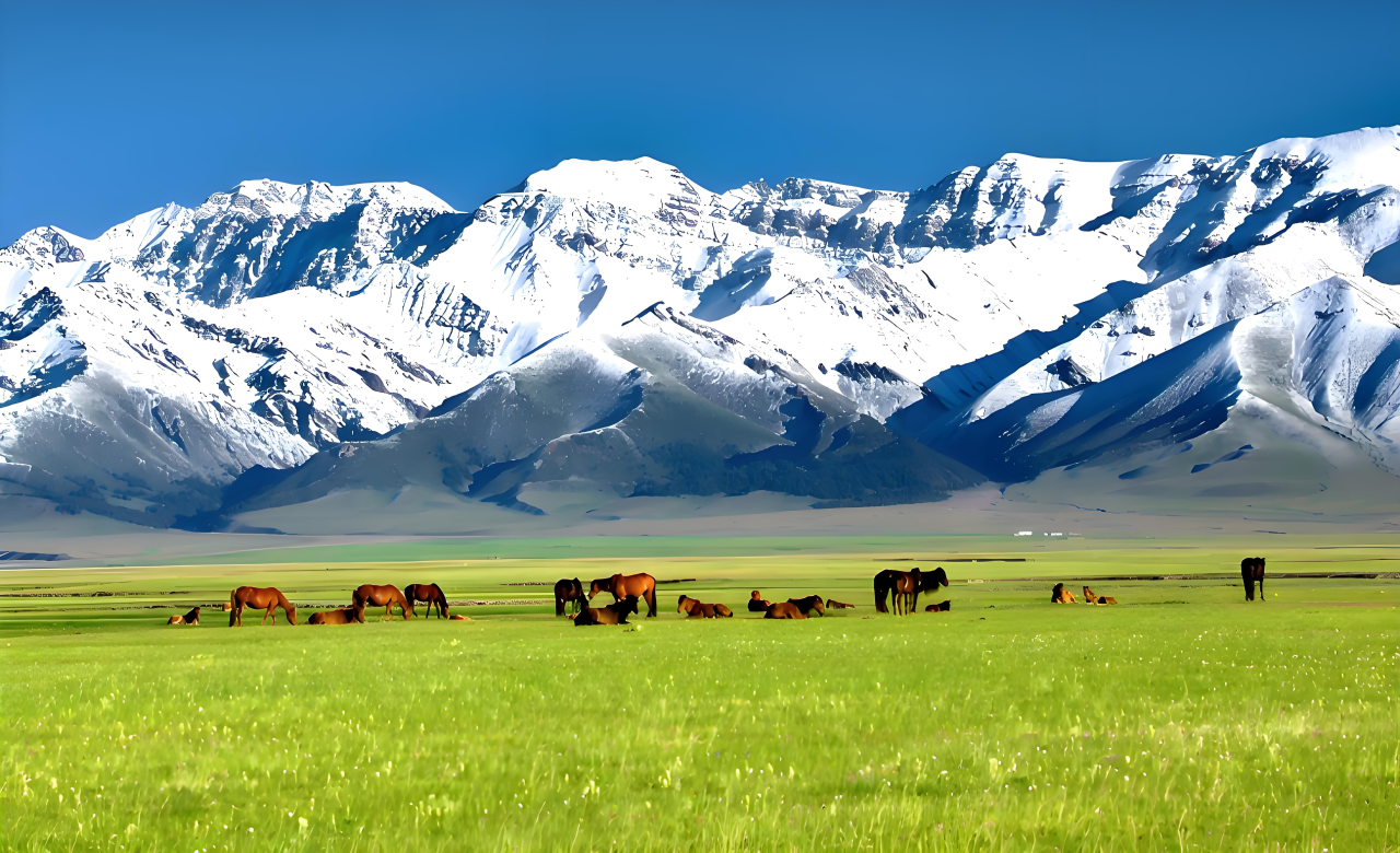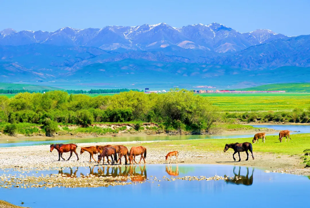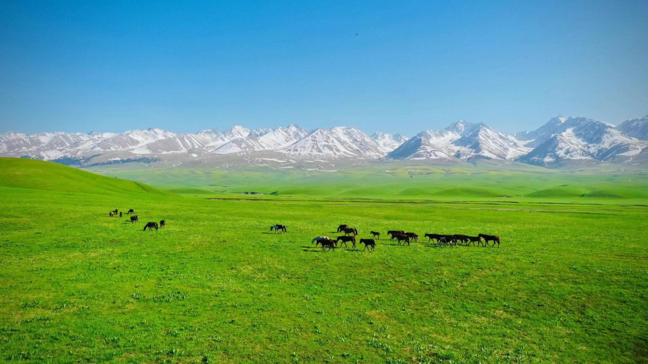 隐藏在天山脚下的昭苏湿地,是伊犁河谷中最迷人的生态秘境。夏季,绿意盎然的草甸延伸至雪山脚下,蜿蜒的河流如银色丝带般穿梭其间。成群的昭苏天马在草原上奔腾踏浪,哈萨克牧民的毡房点缀其间,仿佛一幅流动的油画。