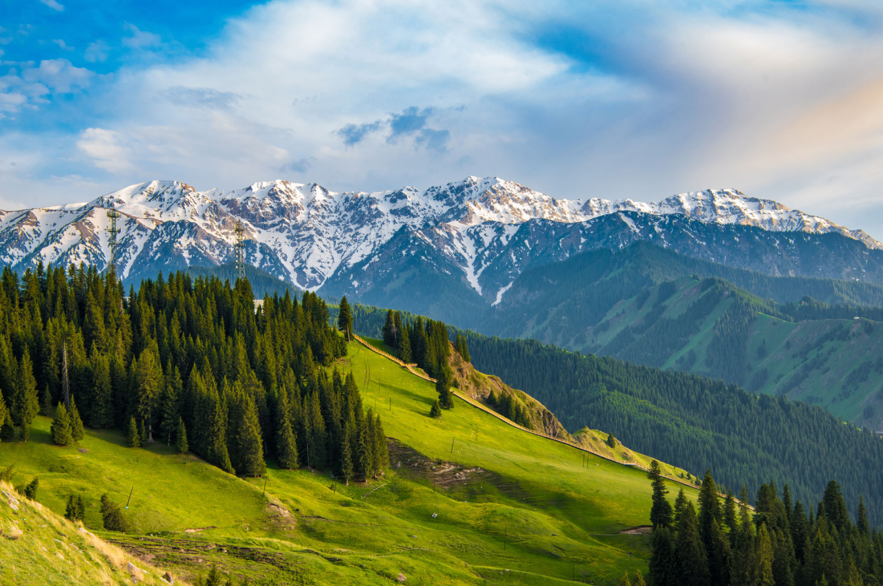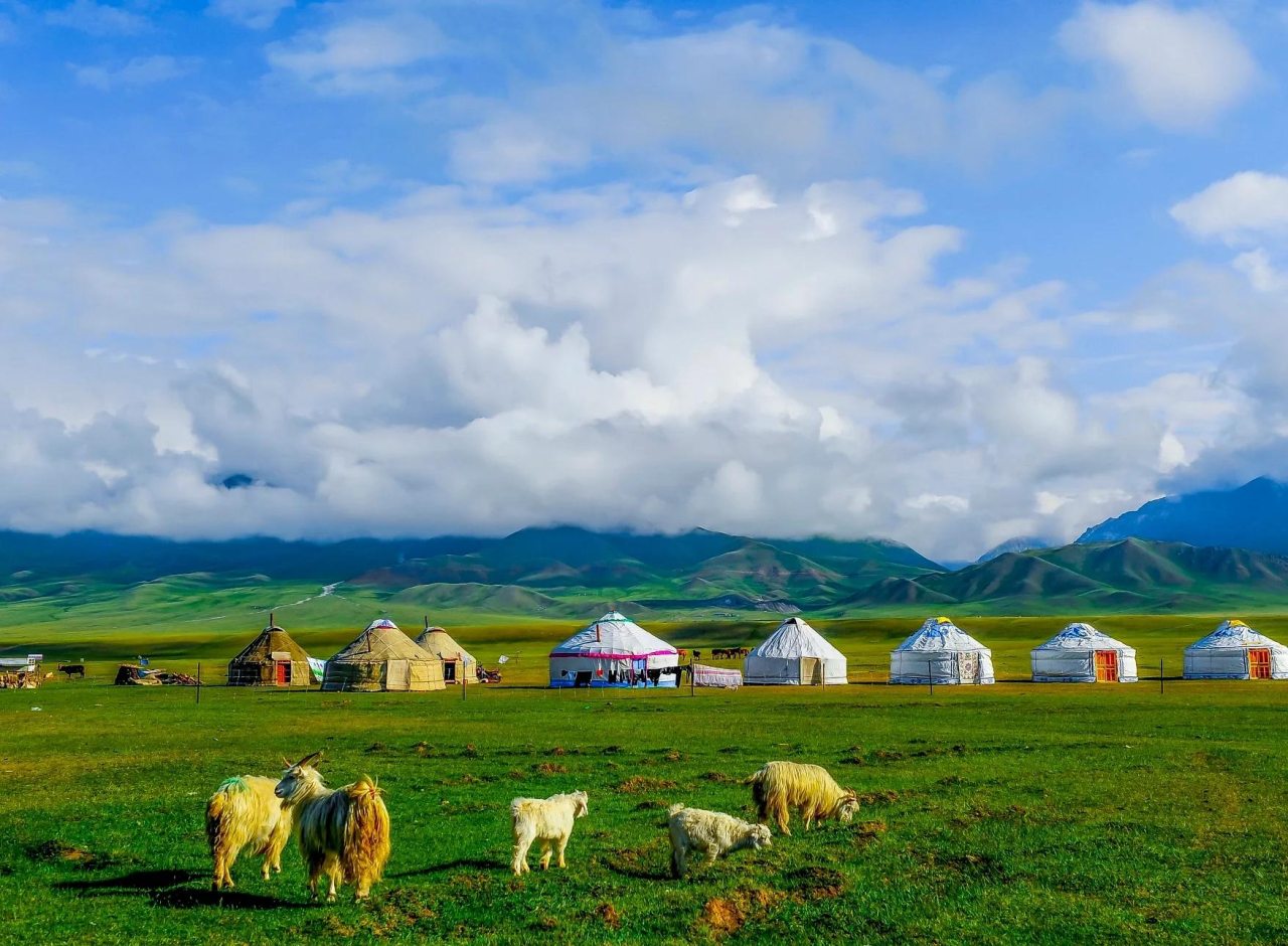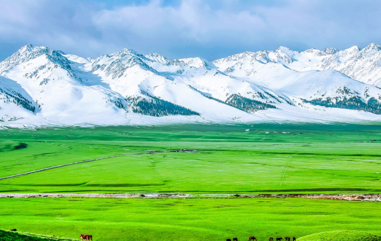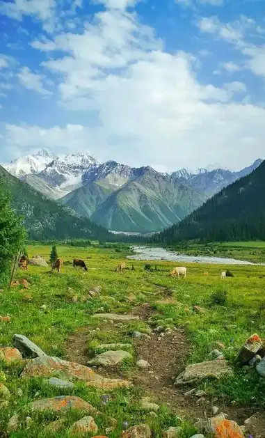 那拉提草原是新疆最著名的草原之一,位于天山脚下。这里的草原起伏连绵,河流蜿蜒,牛羊悠闲地吃草,仿佛一幅生动的画卷。你可以在这里骑马,感受草原的自由与辽阔。