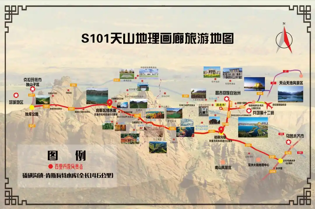 新疆S101天山百里丹霞旅游风景道沿途都是连绵起伏的丹霞地貌和形态各异的侏罗纪山系,被人称为“天山地理风光走廊”,沿途景区主要包括塔西河凤凰湖景区、伟人山景点、凤凰山五道垭(鸽子洞)景区、碧龙湾(肯斯瓦特水库)景区、沙湾温泉、沙湾鹿角湾景区、安集海大峡谷等。每年吸引了不少游客沿途拍摄、探险,成为新疆又一条自驾旅游公路。