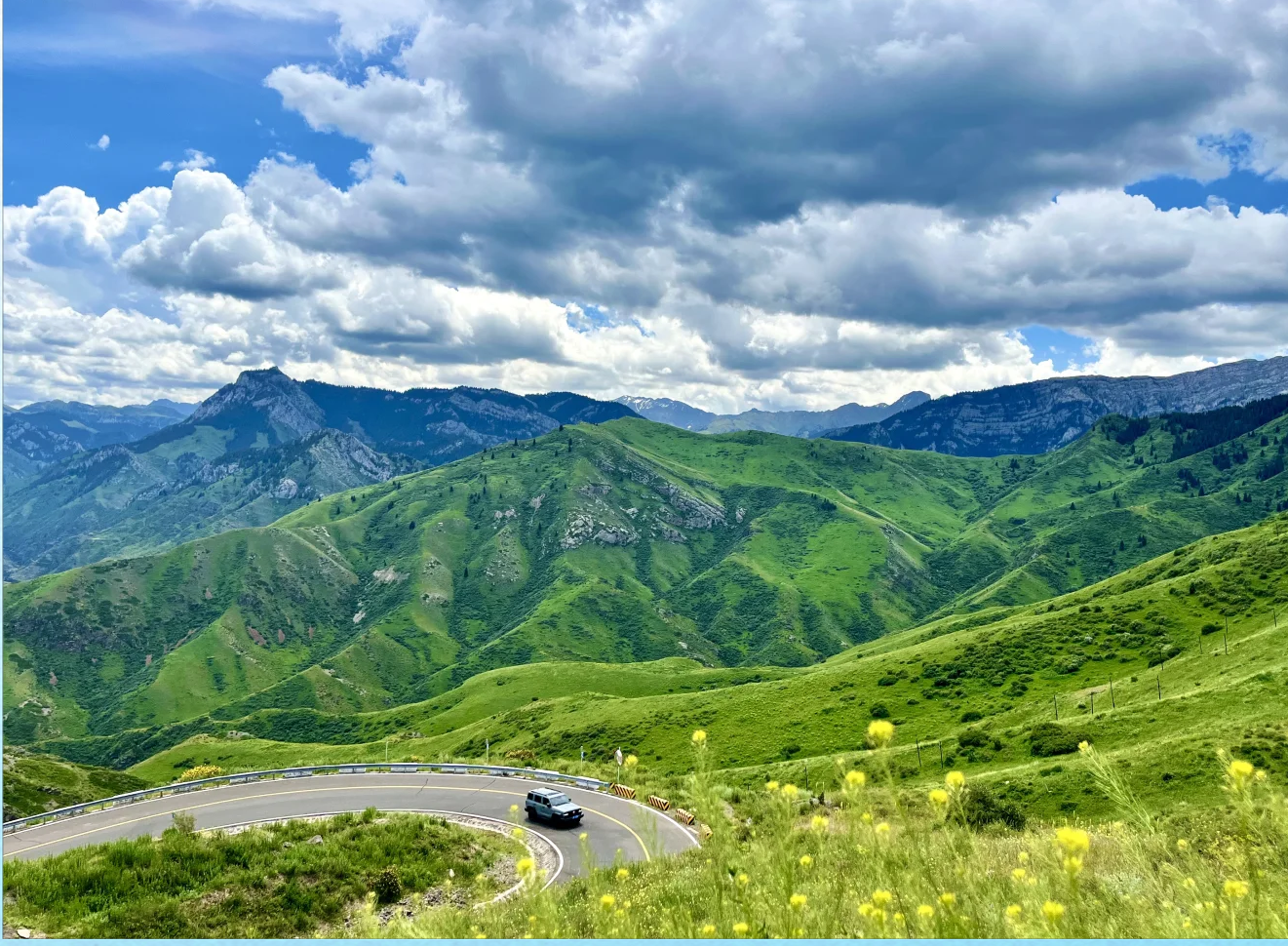 从独山子出发,沿着独库公路前行,你将抵达乔尔玛草原。这里的草原广袤无垠,绿意盎然,牛羊成群,仿佛一幅田园画卷。夏季的乔尔玛草原,野花盛开,是拍照的绝佳地点。