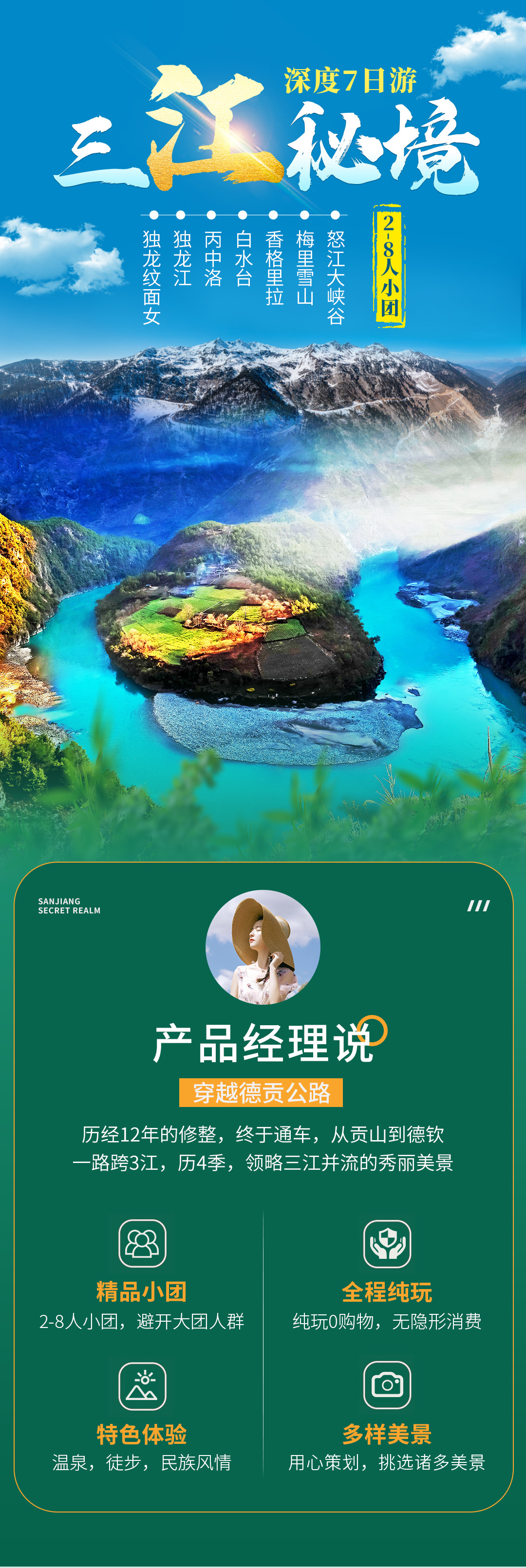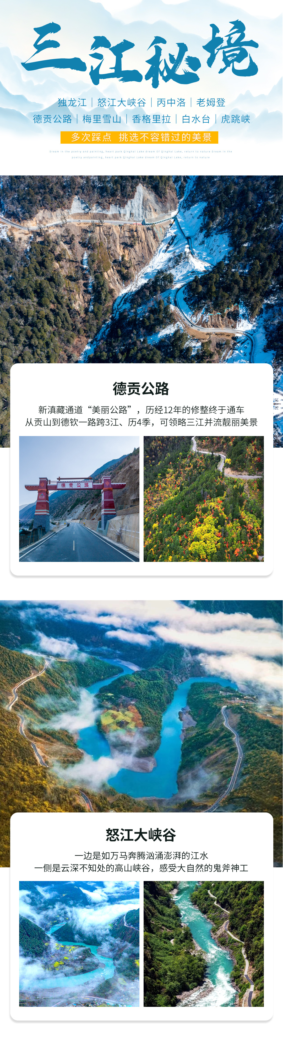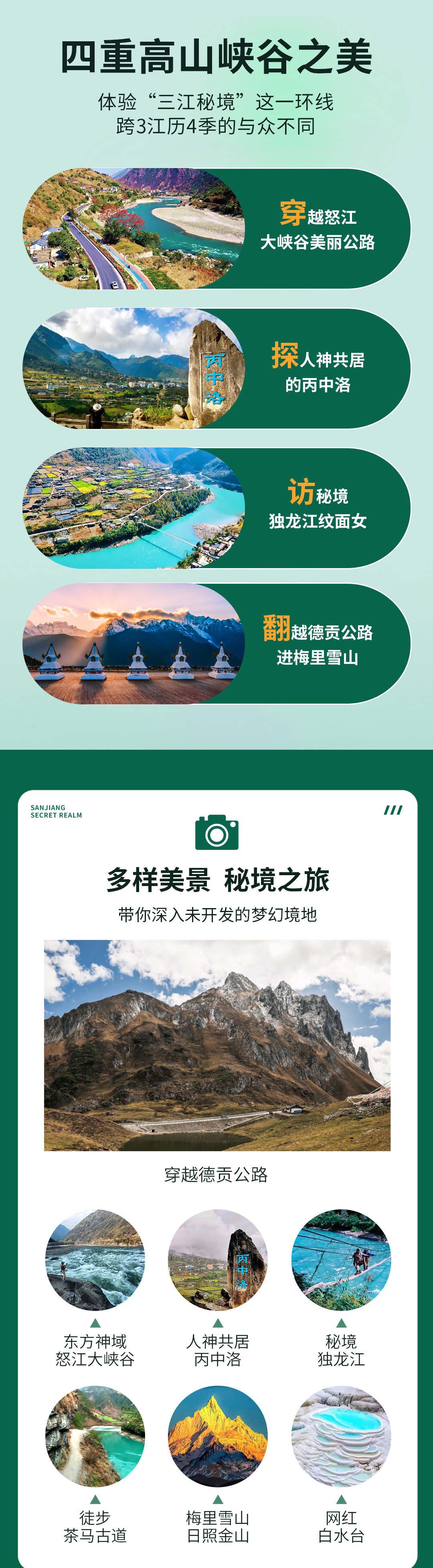 【高山峡谷】穿越怒江大峡谷美丽公路,探人神共居的丙中洛,访秘境独龙江纹面女,翻越德贡公路进梅里雪山, 体验“三江秘境”这一环线跨3江历4季的与众不同。