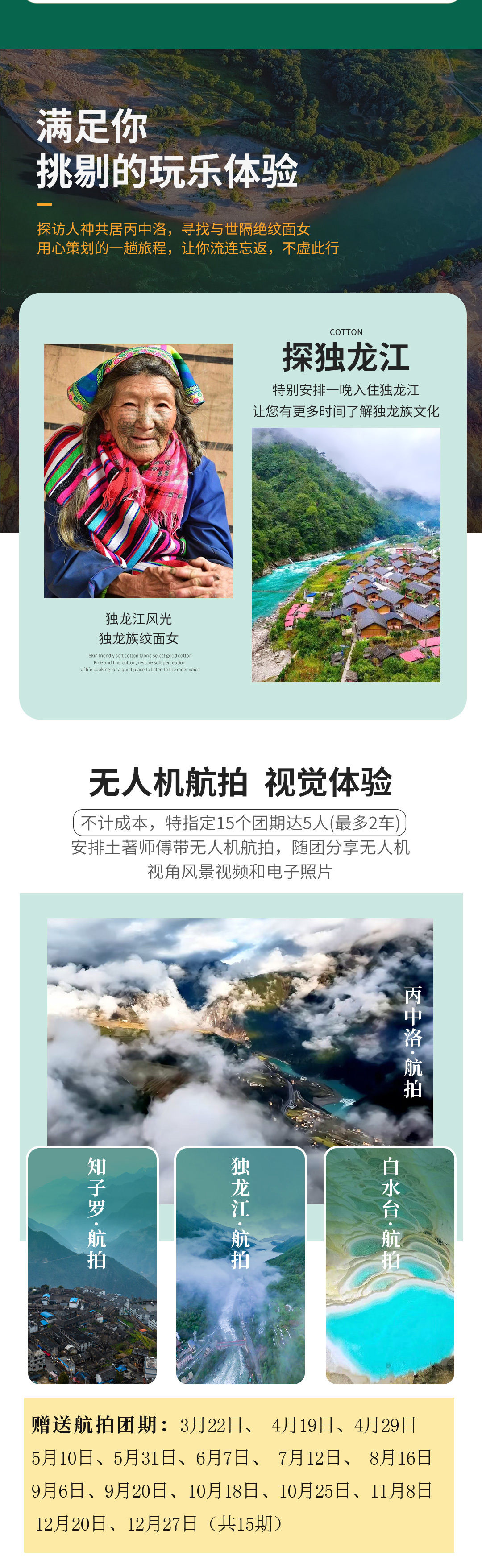 赠送航拍团期共30个团期,每期满5人(最多2车),安排土著师傅无人机航拍体验