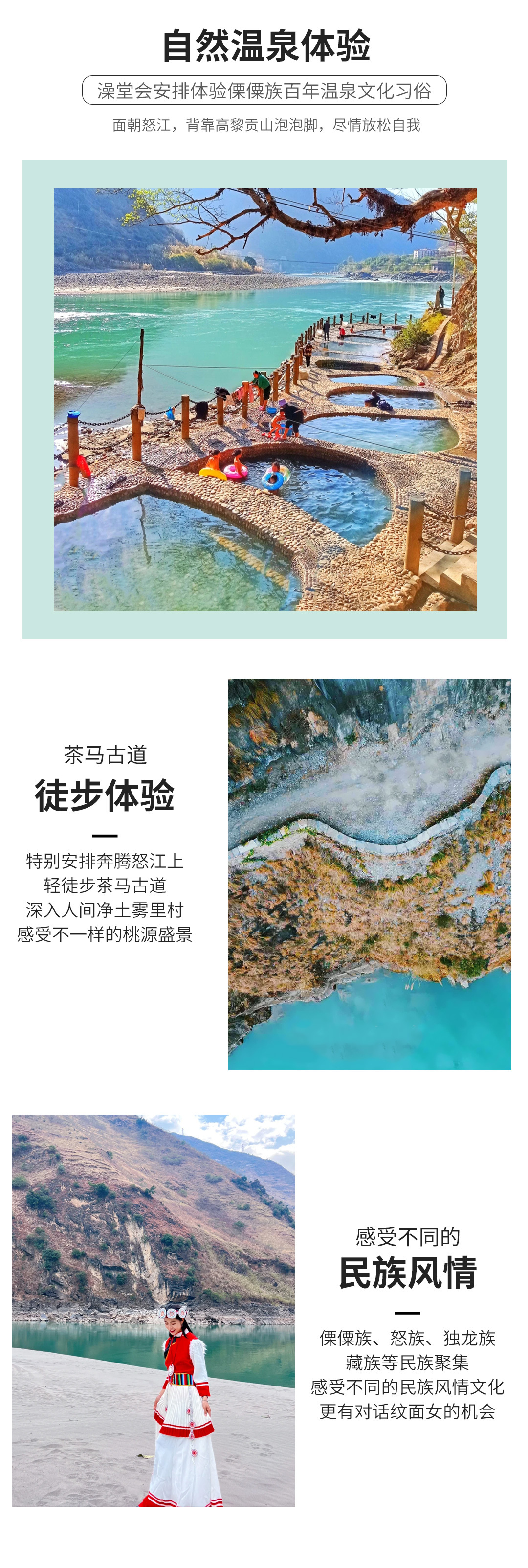 2.徒步茶马古道时,一边是悬崖,一边是滚滚怒江,拍照时请注意脚下,切勿奔跑和打闹,注意安全。