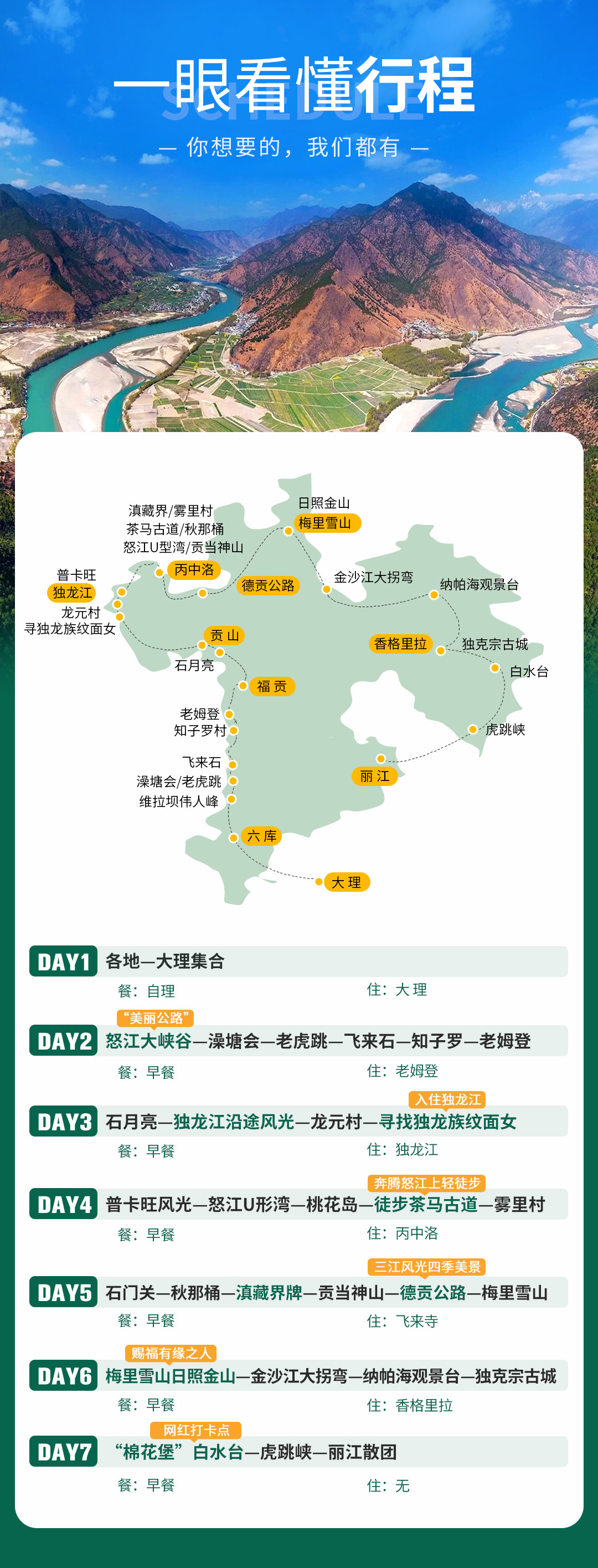 行程对应调整为:D3:老姆登-丙中洛,D4:丙中洛-飞来寺,D5:飞来寺-香格里拉,D6:香格里拉-普达措-白水台,D7:白水台-哈巴雪山观景台-中虎跳观景台-虎跳峡-丽江解散