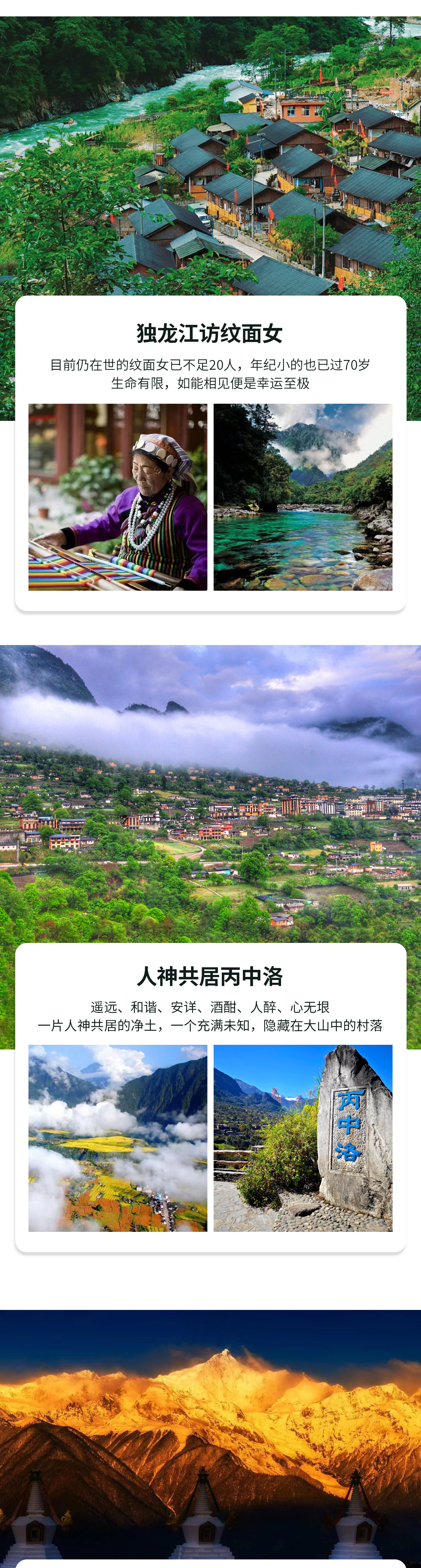 1.人神共居--丙中洛有着碧绿的峡谷、洁白的雪山、瑞士田园般的风光、古老的茶马古道、多民族多宗教和谐共处的地方!