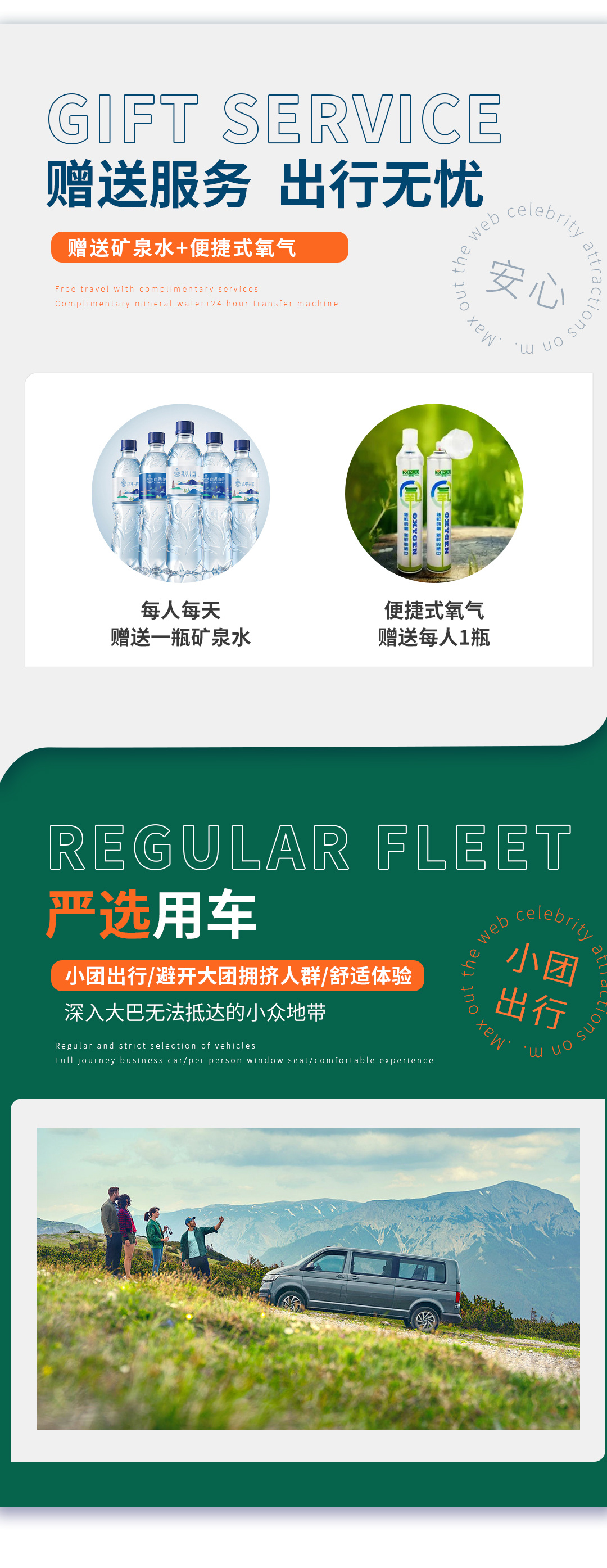 【暖心服务】特别安排每人1瓶应急便捷式氧气,每人每天一瓶矿泉水;