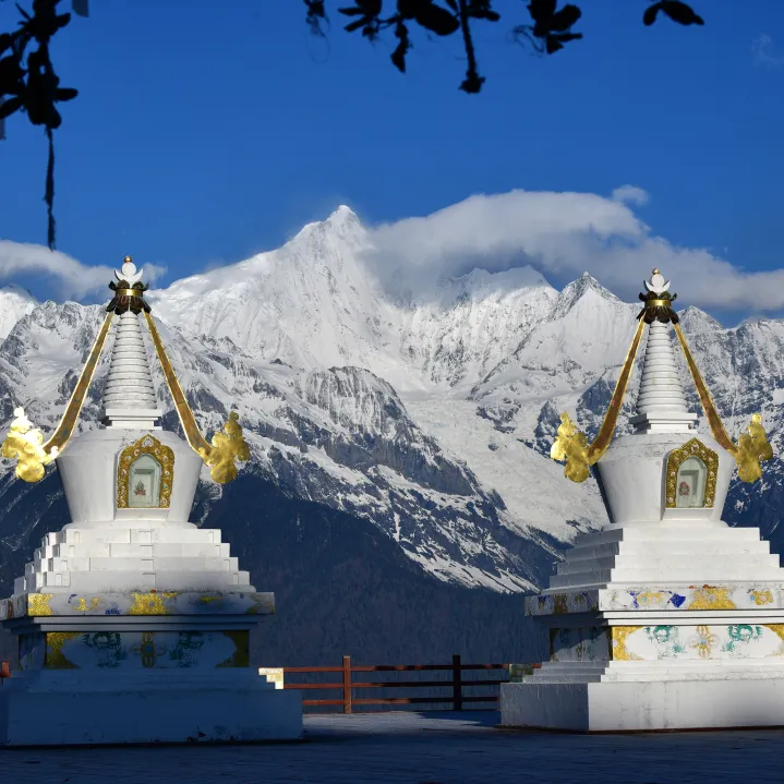 中餐后我们开始【穿越德贡公路】德贡公路的从开始到修建到正式通车用时整整12年之久,一路穿越三江风光历经四季美景,雪山,花海,草甸,森林,江流所有你想得到想不到的自然美,都能在这条道路上相遇。我们翻越【碧罗雪山】,欣赏孔雀山风光,前往【三江并流世界遗产·白茫&梅里片区】,瞻仰享誉藏区的【梅里雪山雄姿(三江并流世界遗产区)】,抵达德钦【梅里雪山】飞来寺(海拔3400米)下榻酒店,面对雪山而居,飞来寺是朝观者观赏和朝拜卡瓦格博峰的好去处,也可在此向卡瓦格博许下你的祈愿;观梅里晚霞(如时间允许,自由安排)晚餐后可以自由的在此享受“人看梅里,月照梅里,梅里望月”的意境!