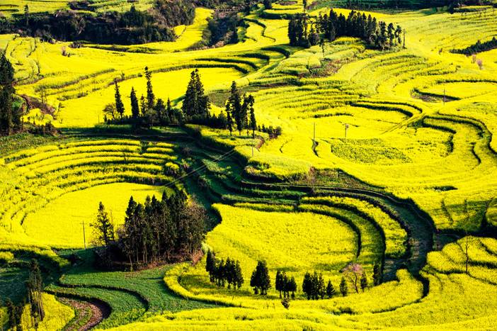 早餐后乘车前往【牛街螺丝田】,放眼望去圆周梯田一圈圈往上延伸,形成螺丝状的田地,像无数金龙盘卧,这是大自然与人工的杰作,历经勤劳智慧的农民修造耕耘,形成了色彩鲜明、线条优美、蔚为壮观的奇妙景色,是罗平油菜花海醉人美丽的地方!
