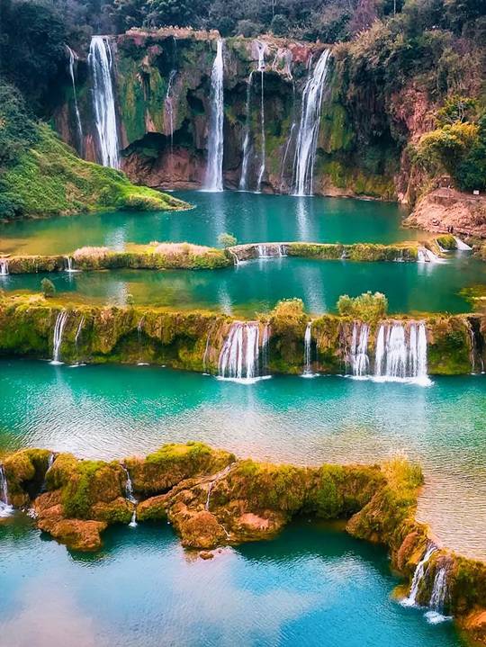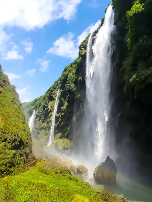随后驱车前往【九龙瀑布】该瀑布是国内有名的瀑布群景观,是罗平古十景之一的“三峡悬流”所在地。九龙瀑布由于特殊的地质构造和水流的千年侵蚀,在此形成了高低宽窄不等的十个梯级,造就了形态各异气势磅礴的瀑布群。在此我们安排乘坐电动【水上竹筏体验】泛舟河上,闯入山水长卷的画中人。