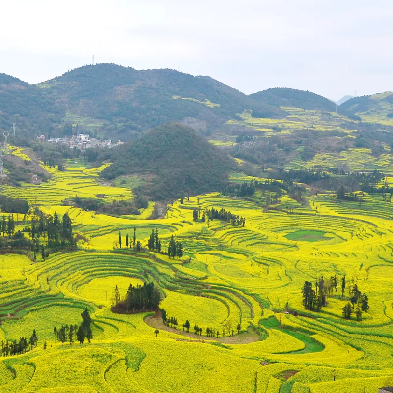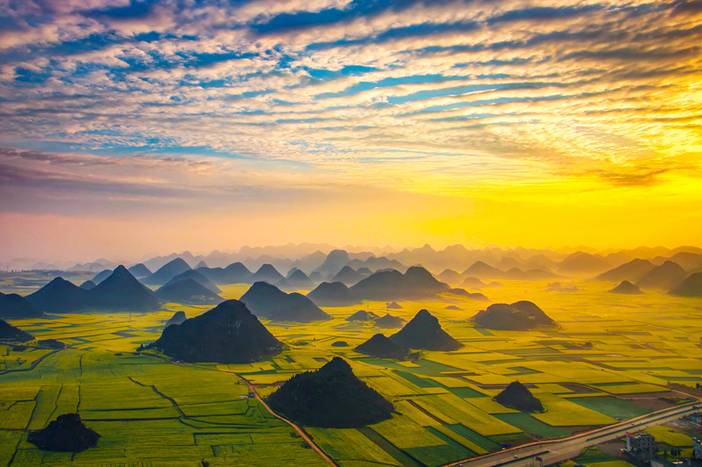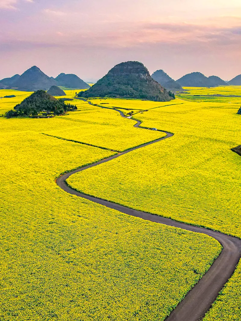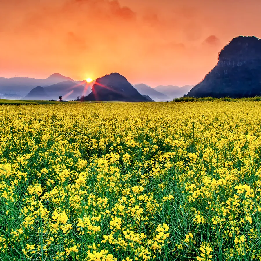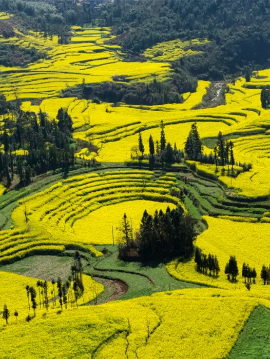 早餐后驱车前往【金鸡峰丛油菜花】,金鸡峰丛占地有近百平方公里,有着特殊的喀斯特地形,许多锥状山头玲珑有致的散落在这一片土地上,高的百余公尺,低的十几公尺,像是雨后春笋一般。在这里还可以拍摄近距离花海,置身于万亩油菜花海的天成花园游玩拍摄。这里有着无边无际的金黄色油菜花海,令人目不暇接。
