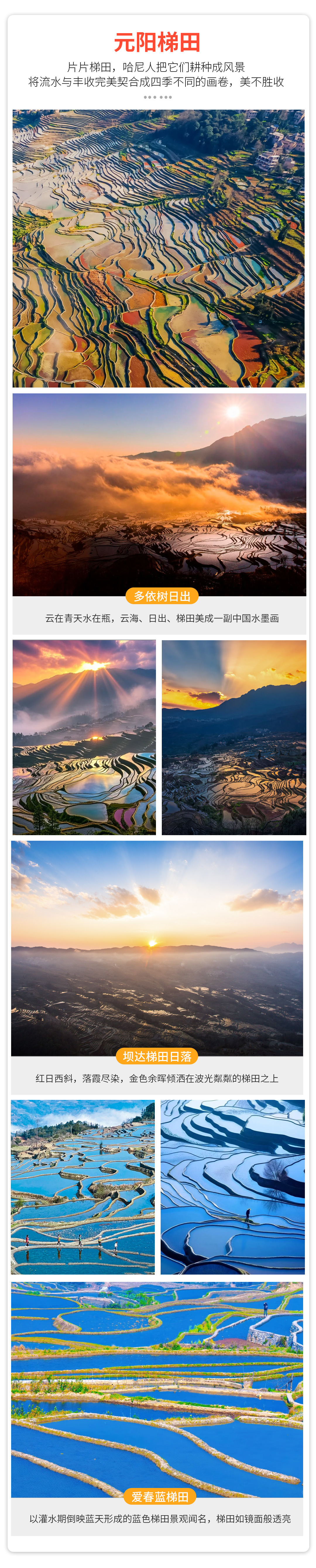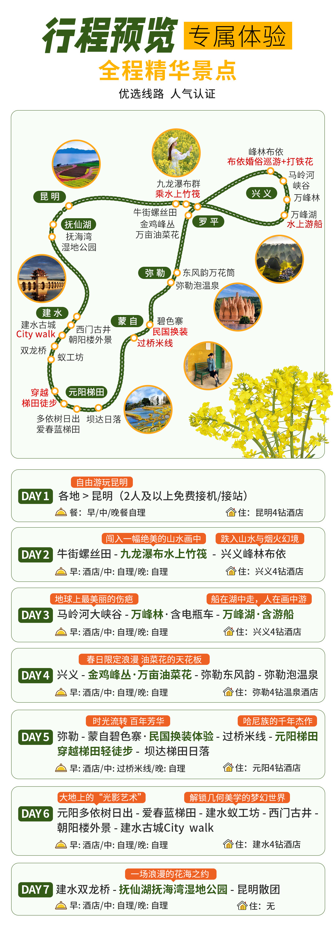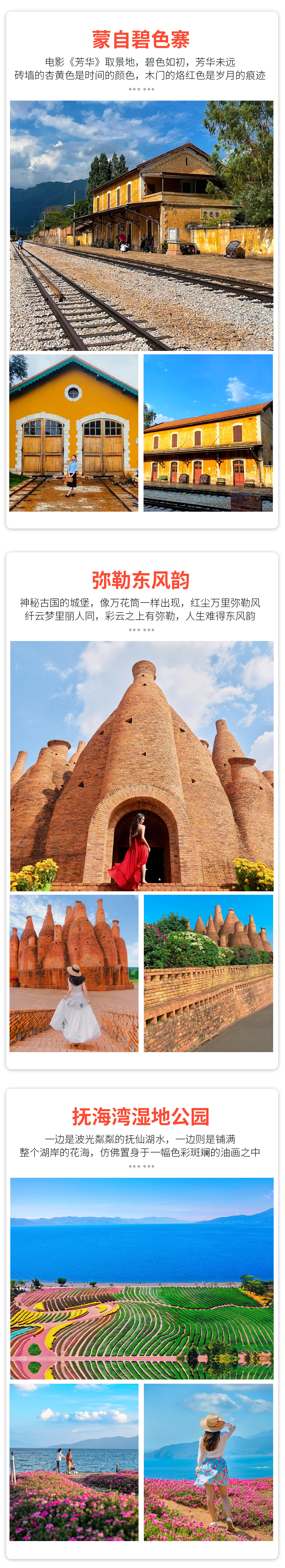 【美景合集】线路风景优美,元素丰富。1)网红秘境全打卡:元阳哈尼梯田+兴义万峰林+罗平油菜花+峰林布依+马岭河峡谷+万峰湖+弥勒东风韵+建水古城+蒙自碧色寨+抚仙湖;2)景点元素丰富:梯田、油菜花田、田园、峰林、古镇、湖泊、铁路、河流、村寨全汇集。