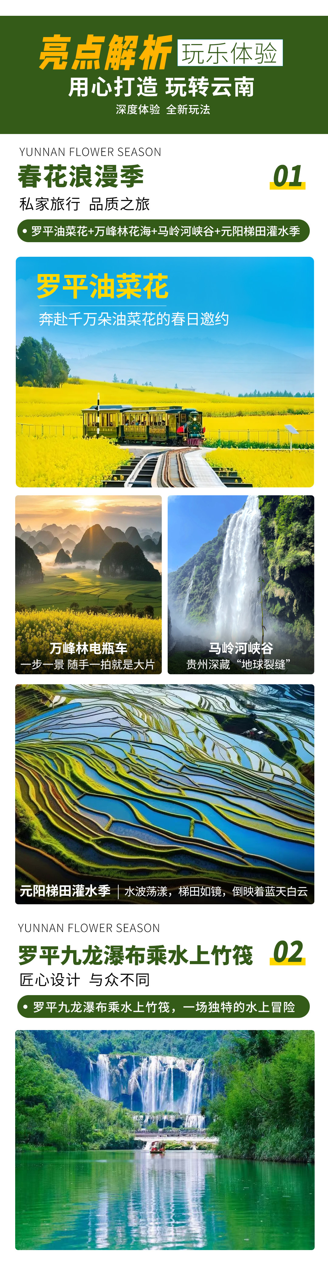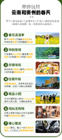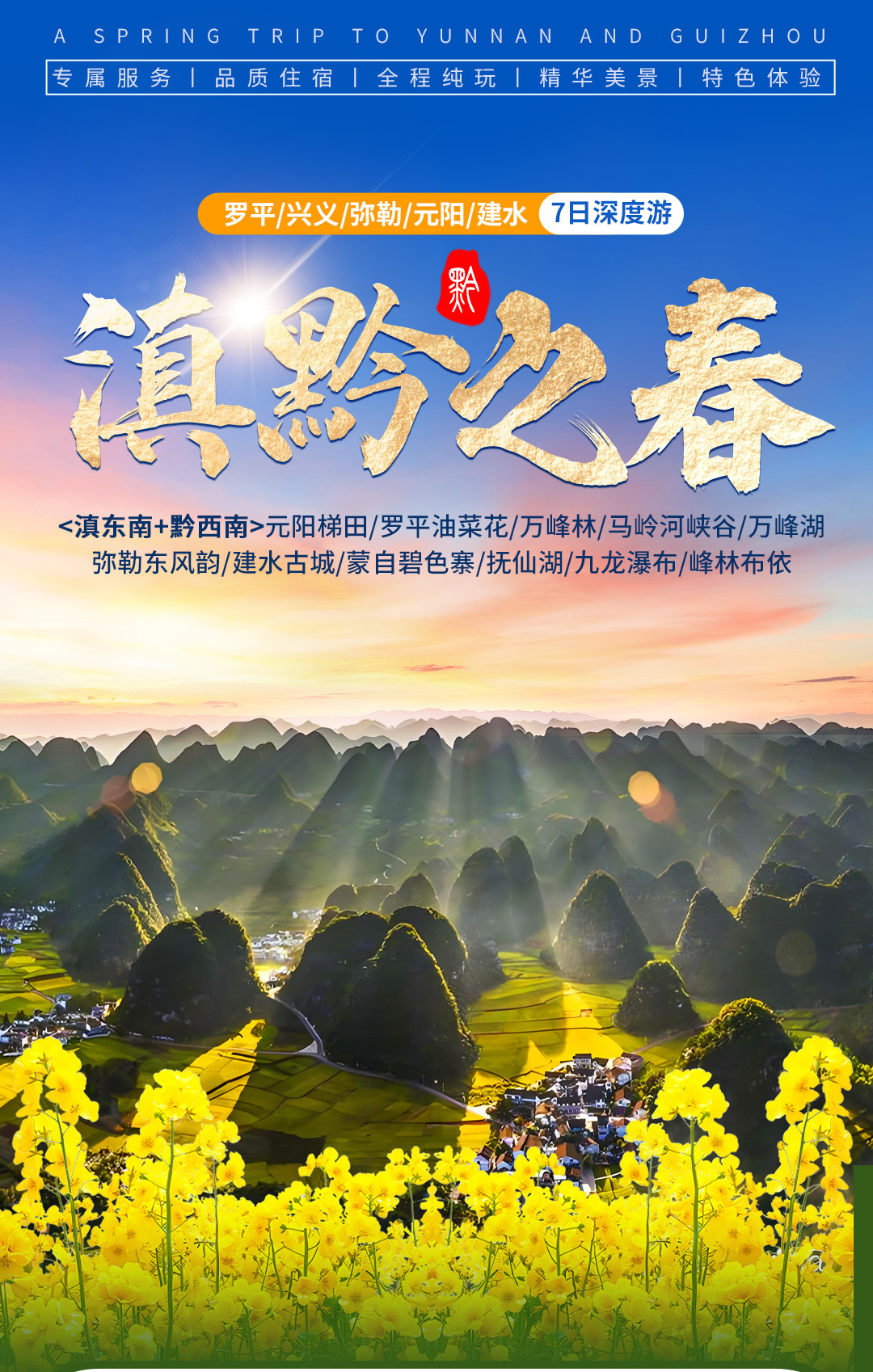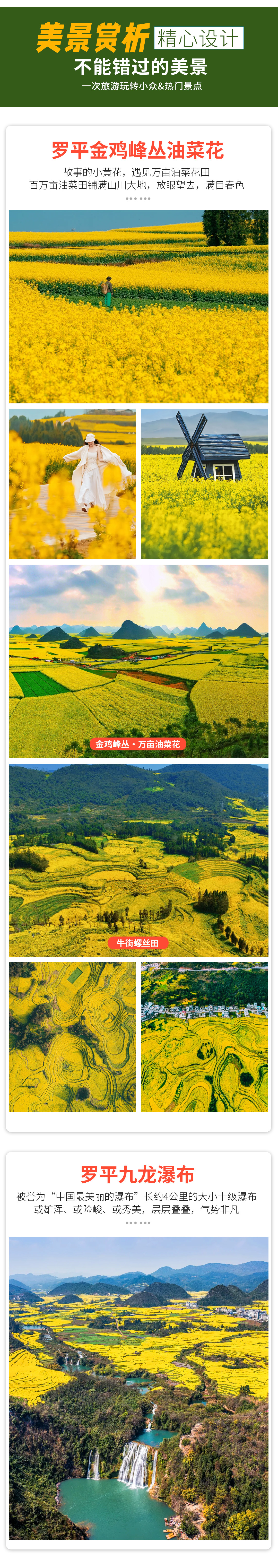 【美景合集】线路风景优美,元素丰富。1)网红秘境全打卡:元阳哈尼梯田+兴义万峰林+罗平油菜花+峰林布依+马岭河峡谷+万峰湖+弥勒东风韵+建水古城+蒙自碧色寨+抚仙湖;2)景点元素丰富:梯田、油菜花田、田园、峰林、古镇、湖泊、铁路、河流、村寨全汇集。