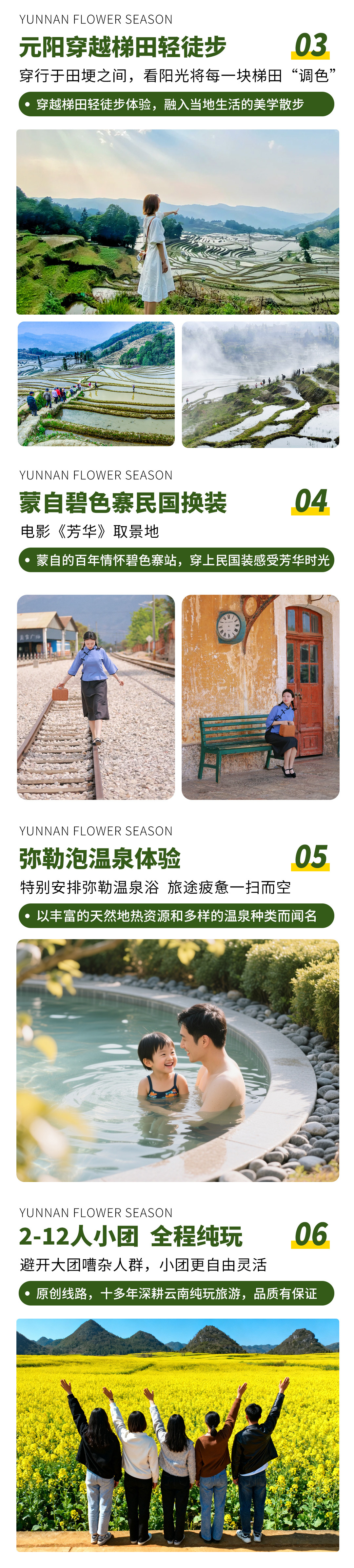 【特别安排】1)罗平九龙瀑布乘电动水上竹筏;2)蒙自过桥米线;3)碧色寨民国换装;4)万峰湖游船;5)弥勒泡温泉;6)峰林布依<布依婚俗巡游+非遗打铁花>;7)元阳穿越梯田轻徒步