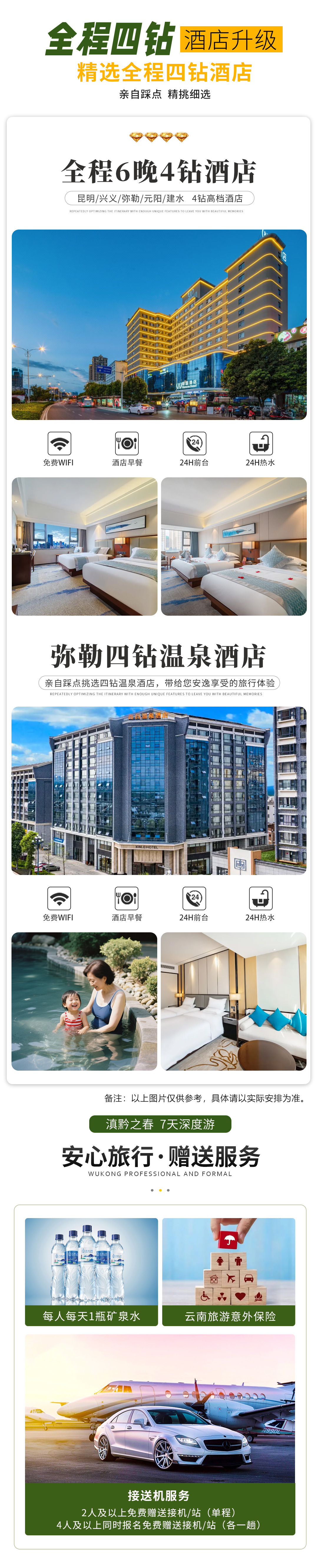 3、住宿:全程6晚四钻酒店(昆明四钻酒店、兴义四钻酒店、弥勒四钻温泉酒店、元阳梯田四钻酒店、建水四钻酒店)