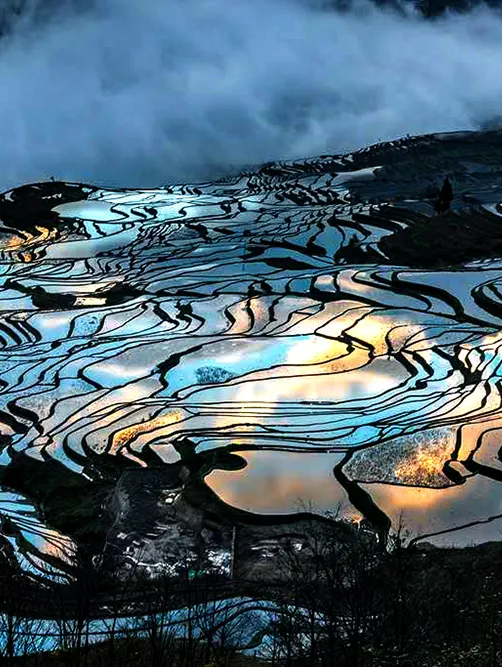 最后前往梯田阶梯极多的【坝达梯田】拍摄日落,这里的梯田一面环山,其他三面都是梯田,气势磅礴非常广阔。站在观景台可以俯瞰梯田,线条优美壮观,立体感强,非常壮观,让人不得不赞美哈尼族是真正的大地雕塑家。当晚我们安排入住元阳梯田核心景区,方便次日观赏拍摄壮观的梯田日出。