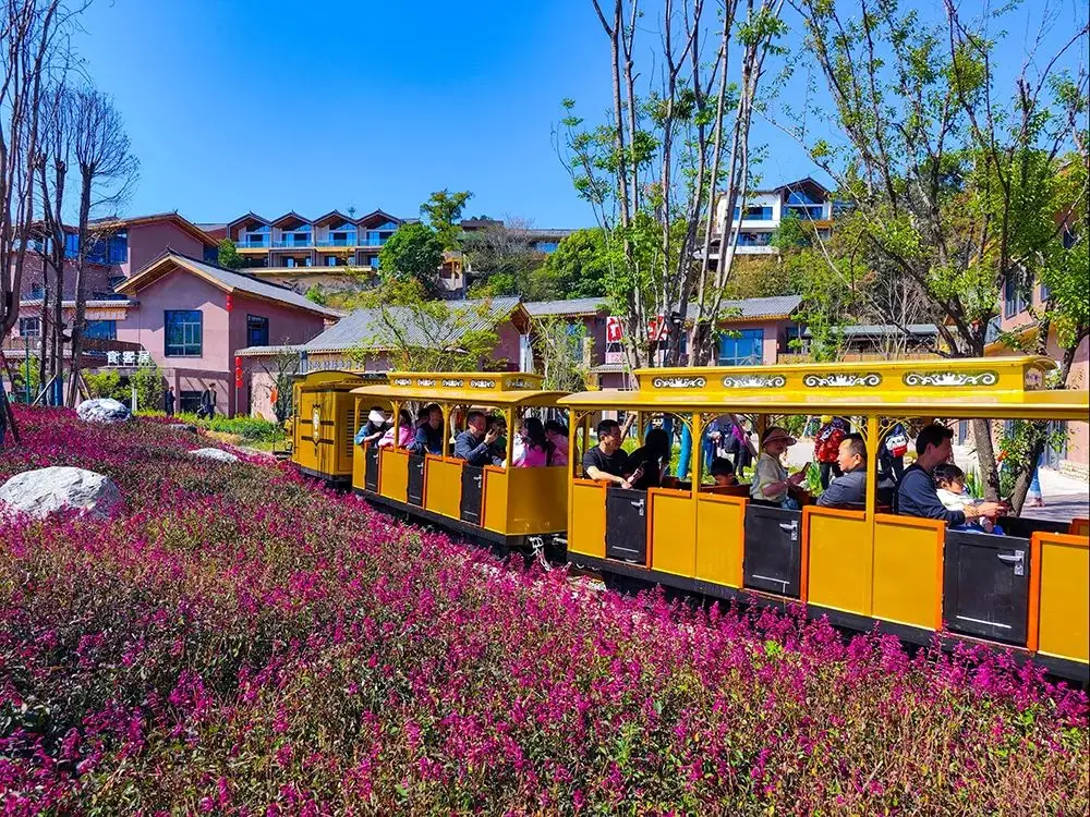 春天可以乘坐花海小火车环绕大石板古村,十分惬意。