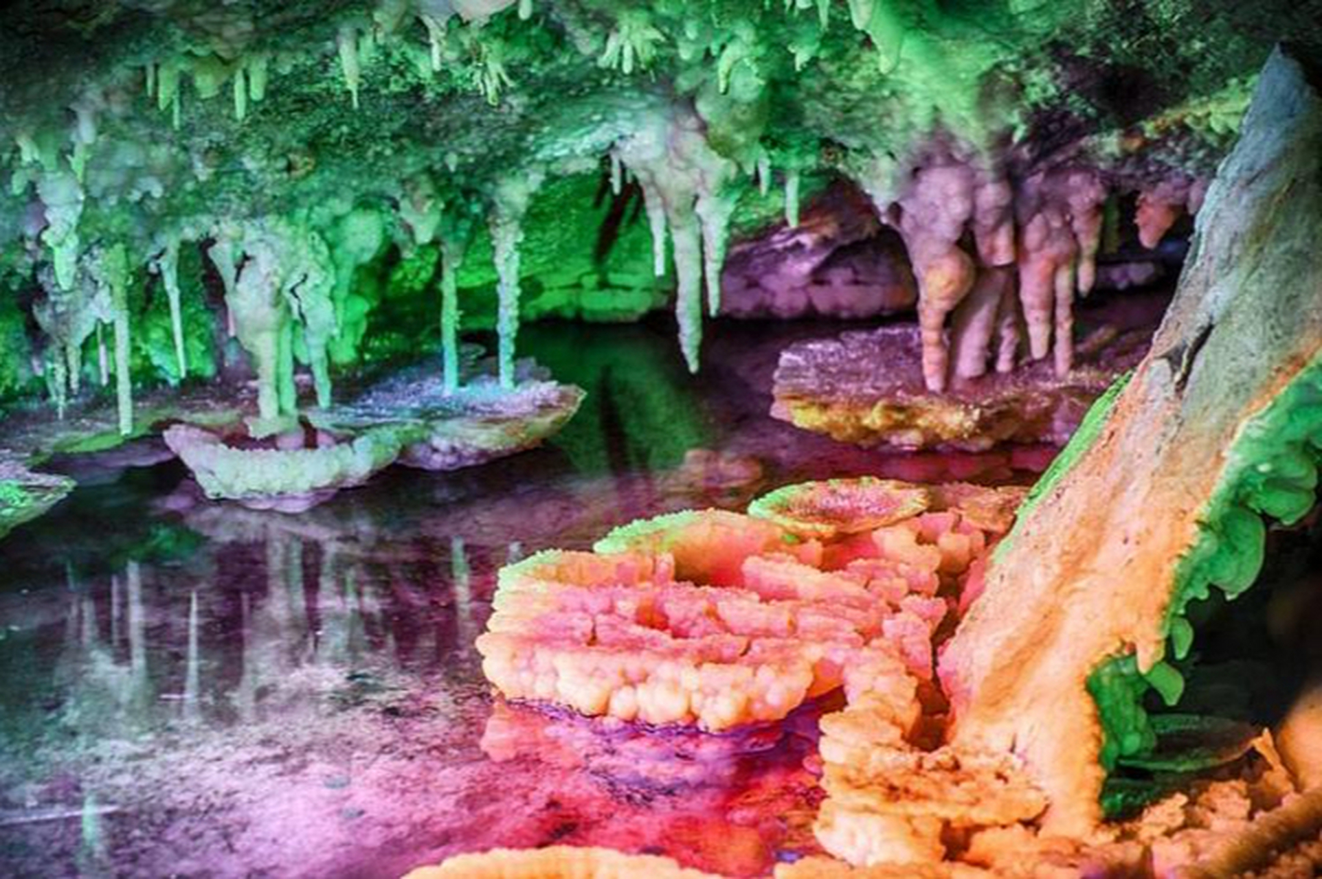 天宫段:以七彩钟乳石为主,形成雪山冰瀑、梦幻白宫、瑶池仙境等绝景,钟乳石形态各异,色彩斑斓。