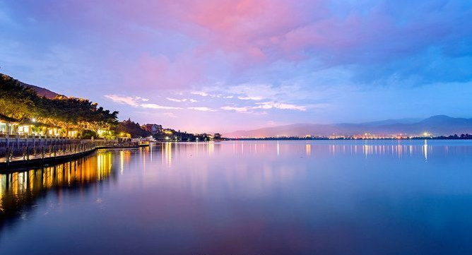 日落时间、太阳西沉,天空灿金,当邛海湖面被光辉平铺的那一刻,人间温柔便有了具象化。