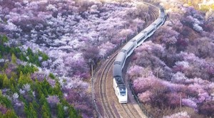 铁路两侧漫山山桃花、杏花盛开